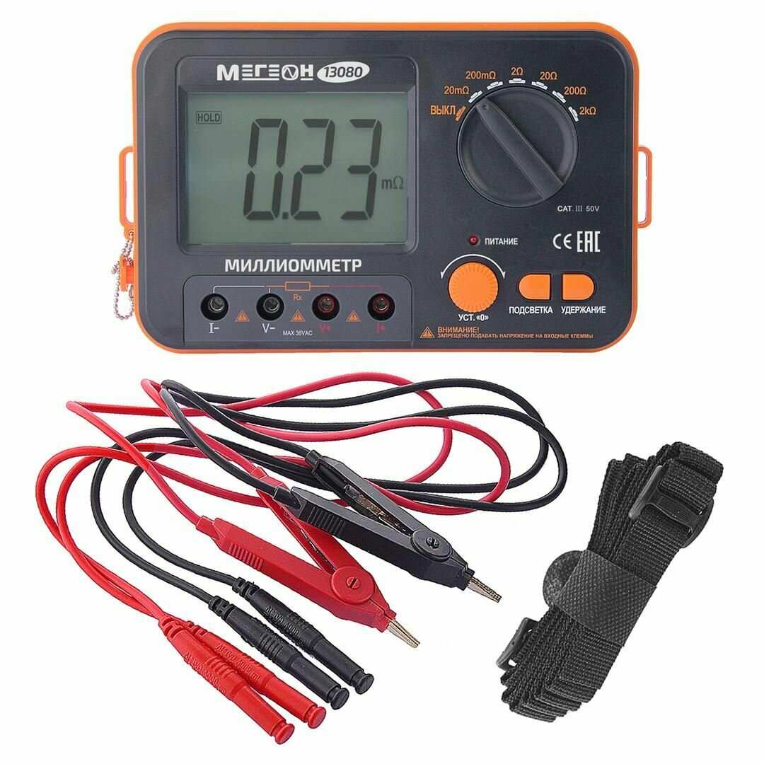 | Комплект поставки | 4-х проводной диагностический вывод - 1 пара., Цифровой миллиомметр МЕГЕОН 13080 - 1 шт., батарея ААА (1.5В) - 6 шт., гарантийный талон - 1 экз., наплечный ремень - 1 шт., руководство по эксплуатации - 1 экз. |