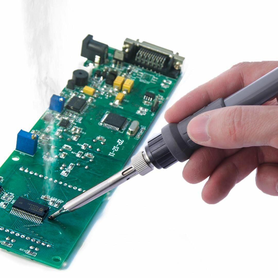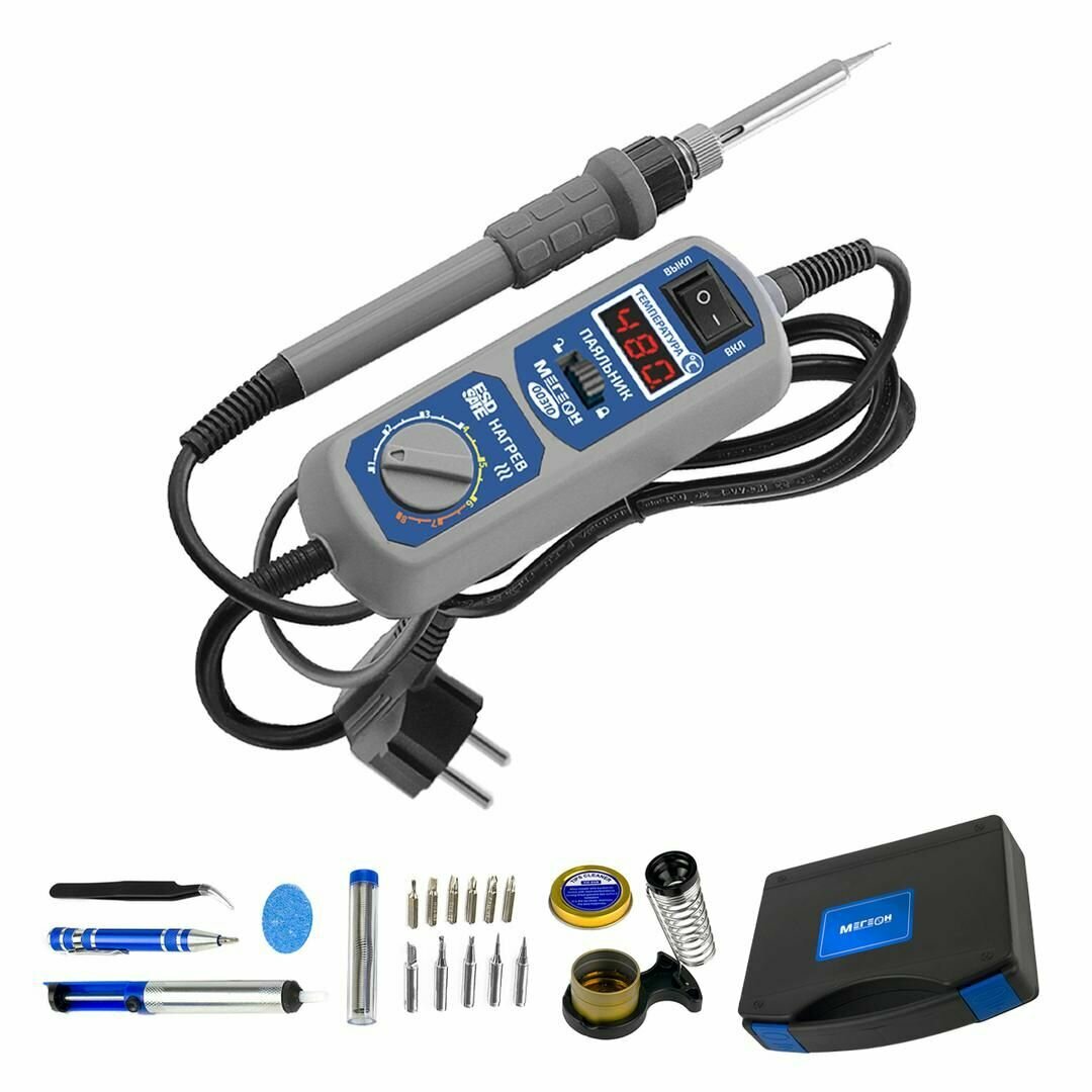 МЕГЕОН - это набор для пайки, включающий в себя удобный паяльник с цифровым управлением температурой. Сам набор представляет из себя полноценный комплект для проведения работ с радиокомпонентами и лужения. Немаловажным преимуществом при работе с паяльником является маленький вес и мягкий провод. Яркий светодиодный дисплей и удобный регулятор для установки. 6 сменных наконечников разной формы (один из них на паяльнике). В комплекте предусмотрено все необходимое для проведения работ: металлическая баночка с канифолью и очистителем наконечника, кроме этого в комплекте губка для чистки, припой, пинцет, оловоотсос и ручка-отвертка с 7 сменными битами. Всё это упаковано в удобный пластиковый кейс для хранения и транспортировки. Набор будет незаменимым помощником и займёт достойное место в арсенале профессионала или любителя, а также может послужить прекрасным, а самое главное нужным подарком.Преимущества Удобный паяльник с цифровой индикацией Яркий светодиодный дисплей Удобный регулятор для установки температуры 6 сменных наконечников разных форм и размеров Подставка с баночкой для канифоли и очистителя с губкой Припой Пинцет Оловоотсос Ручка-отвёртка с 7 сменными битами Удобный кейс