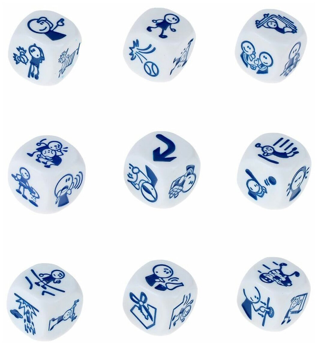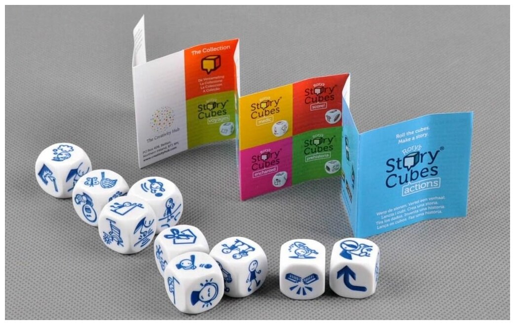 Итак, в наборе девять шестигранников, на стороны которых нанесены 54 неповторяющиеся картинки с разными активностями и действиями. Вам придется их между собой связать. Берите все кубики в руку, хорошенько трясите и бросайте. Картинки, которые выпали должны составлять сюжет вашей истории. Разделите шестигранники на три группы (по три кубика в каждой) и начинайте фантазировать. Первые три кубика — это начало истории, следующие — продолжение, а последняя тройка — концовка.