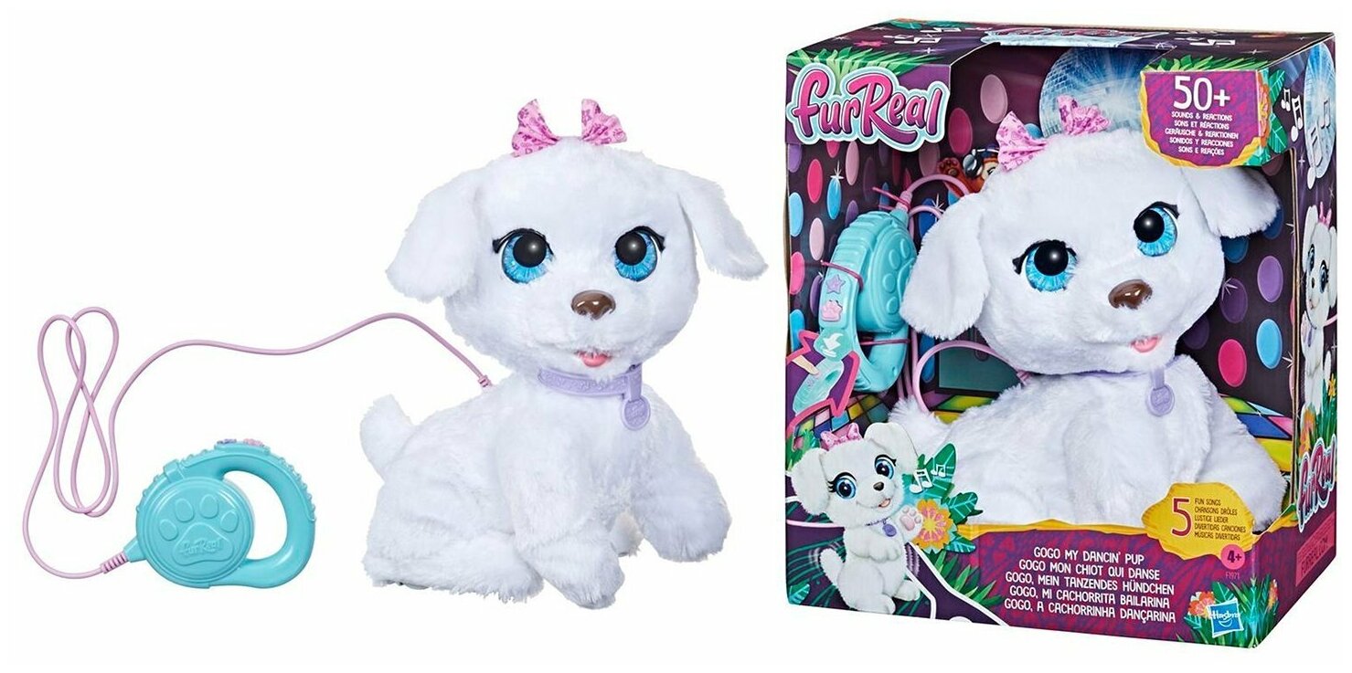FurReal Friends Игрушка - если вы любите и домашних животных, и танцы, интерактивный питомец приведет вас в настоящий восторг. Очаровательный электронный щенок поставляется с простым в использовании автоматическим поводком. Интерактивный электронный щенок проигрывает 5 потрясающих песен, под которые вам будет так весело танцевать вместе Нажмите на танцевальную кнопку на поводке, и собачка продемонстрирует свои особые движения для танцев под крутые мелодии, присоединяйтесь к ГоГо Нажмите на прогулочную кнопку, и пушистый песик отправится гулять, качая головой, радостно гавкая и издавая милые щенячьи звуки Замечательный подарок для детей от 4 - х лет, которые любят животных и обожают танцы Для детей от 4 - х лет Для работы требуются батарейки: 4 х АА В комплекте: 1 питомец аксессуар инструкция