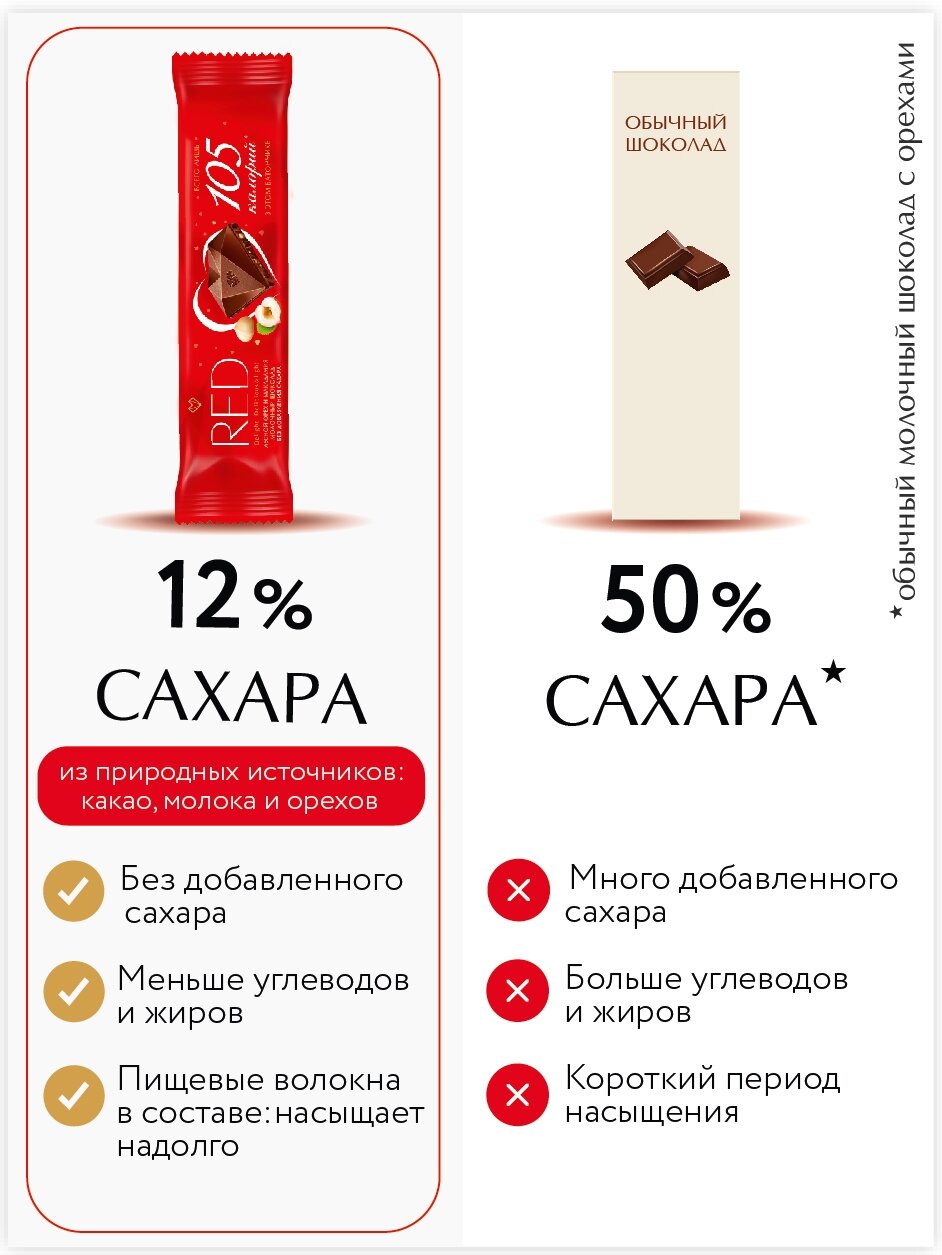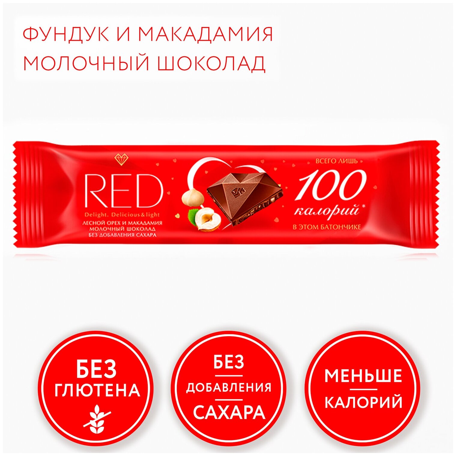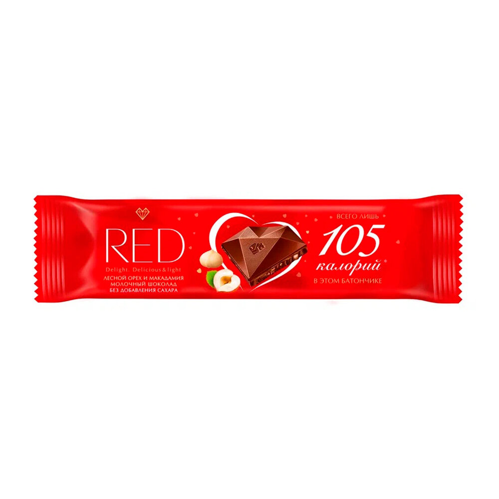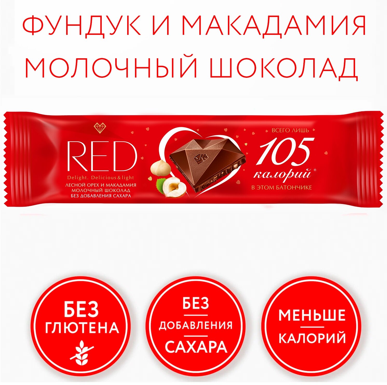 Описание товара:Red - легкий и нежный молочный шоколад без сахара. Сочетание фундука и макадамии открывает новый вкус для ценителей настоящего удовольствия. В аромате нотки обжаренных орехов, во вкусе – нежность молочного шоколада. Теперь в удобном формате батончика - удобно взять с собой на перекус. Без добавления сахара. Вместо сахара подсластители, получаемые из фруктов и растений. Меньше калорий: до -35% меньше калорий, чем в аналогичном шоколаде других марок. Вкусный: отборное какао из Côte d’Ivoire и нежный сливочно - ореховый вкус молочного шоколада, который так ценят потребители. Отличный выбор для ЗОЖ и ПП: без добавления сахара, меньше калорий и углеводов, без пальмового масла, без глютена, подходит для читмила, удобный порционный формат для тех, кто считает калории. Сделано в Европе: шоколад Red изготавливает швейцарская компания Chocolette Confectionary на своей новой фабрике в Латвии. Качество шоколада гарантировано сертификатом BRC, признанным в 30 странах мира.Состав товара:Подсластители: мальтит, эритрит; полидекстроза (наполнитель); масло какао; какао тертое; сухое цельное молоко; сухое обезжиренное молоко; дробленый фундук 2%; молочный жир; дробленая макадамия 1%; эмульгаторы: лецитин соевый, Е476; каррагинан (загуститель); ароматизаторы.Меры предосторожности:Может содержать орехи (миндаль, фундук, укшью, макадамию). Содержит подсластители. При чрезмерном употреблении может оказывать слабительное действие.