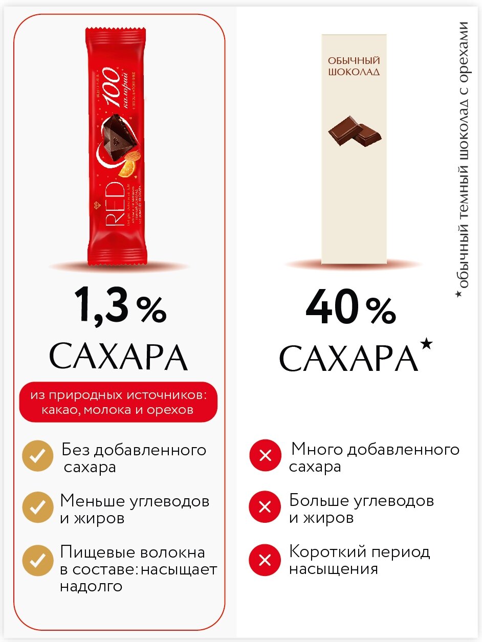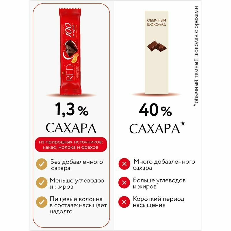 RED - как часть спортивного питания: в одном шоколадном батончике RED всего 100 ккал - удобно при подсчете калорий, он сладкий, но без сахара - идеально для читмила (планового нарушения диеты).