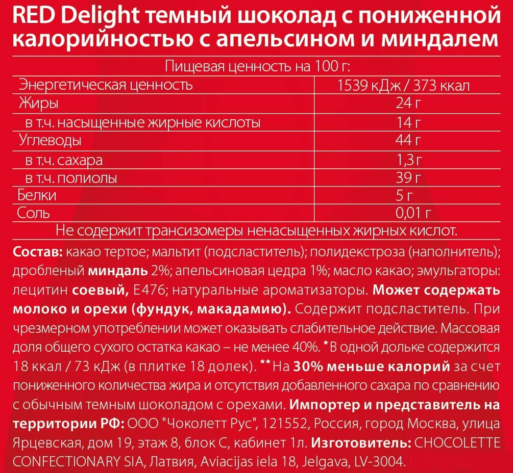 | Состав | какао тертое, эритрит (подсластитель), полидекстроза (наполнитель), дробленый миндаль 2%, апельсиновая цедра 1%, молочный жир, масло какао, каррагинан (загуститель), эмульгаторы |