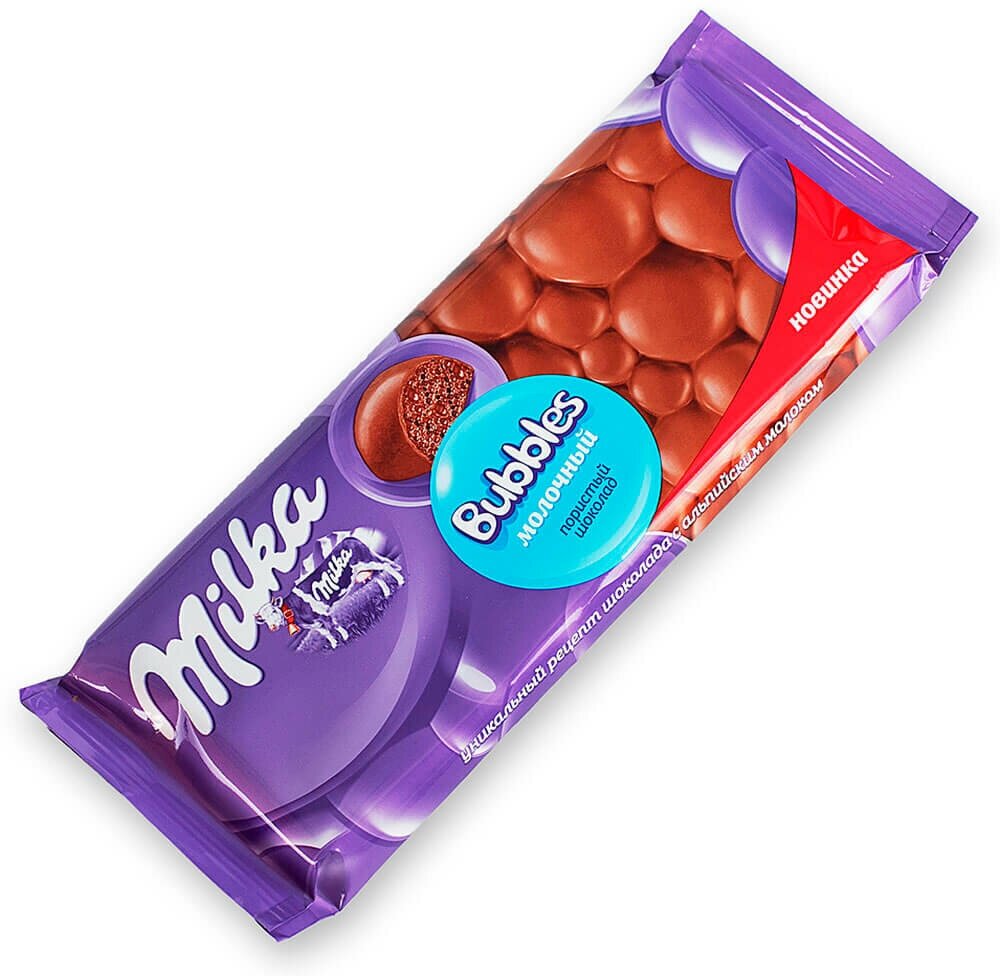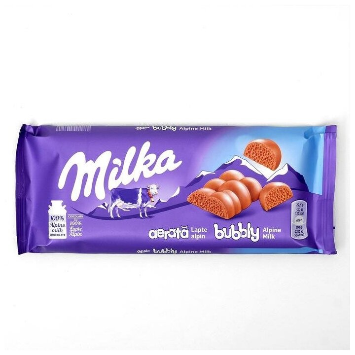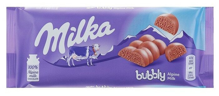 Пористый молочный шоколад Milka Bubbles приятно удивляет нежным и мягким вкусом. Это классическая плитка, поделенная на дольки для удобства отламывания.