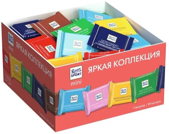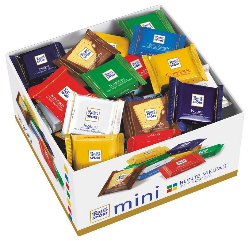 Набор мини-шоколада Ritter Sport Bunter Mix имеет общую массу в 1400 г. Здесь представлены разные вкусы мини-версий шоколада этой торговой марки. Они упакованы в одну большую брендовую коробку.