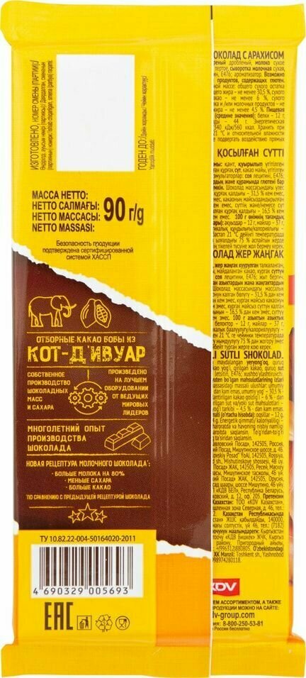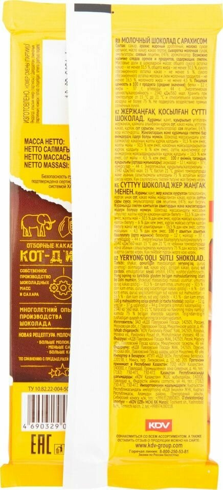 | Состав | молочный шоколад (сахар, масло какао, какао тертое, молоко сухое цельное, сухая молочная сыворотка, обезвоженный молочный жир, эмульгаторы (соевый лецитин, E476), ароматизатор - ванилин), арахис жареный, массовые доли в шоколадной массе |