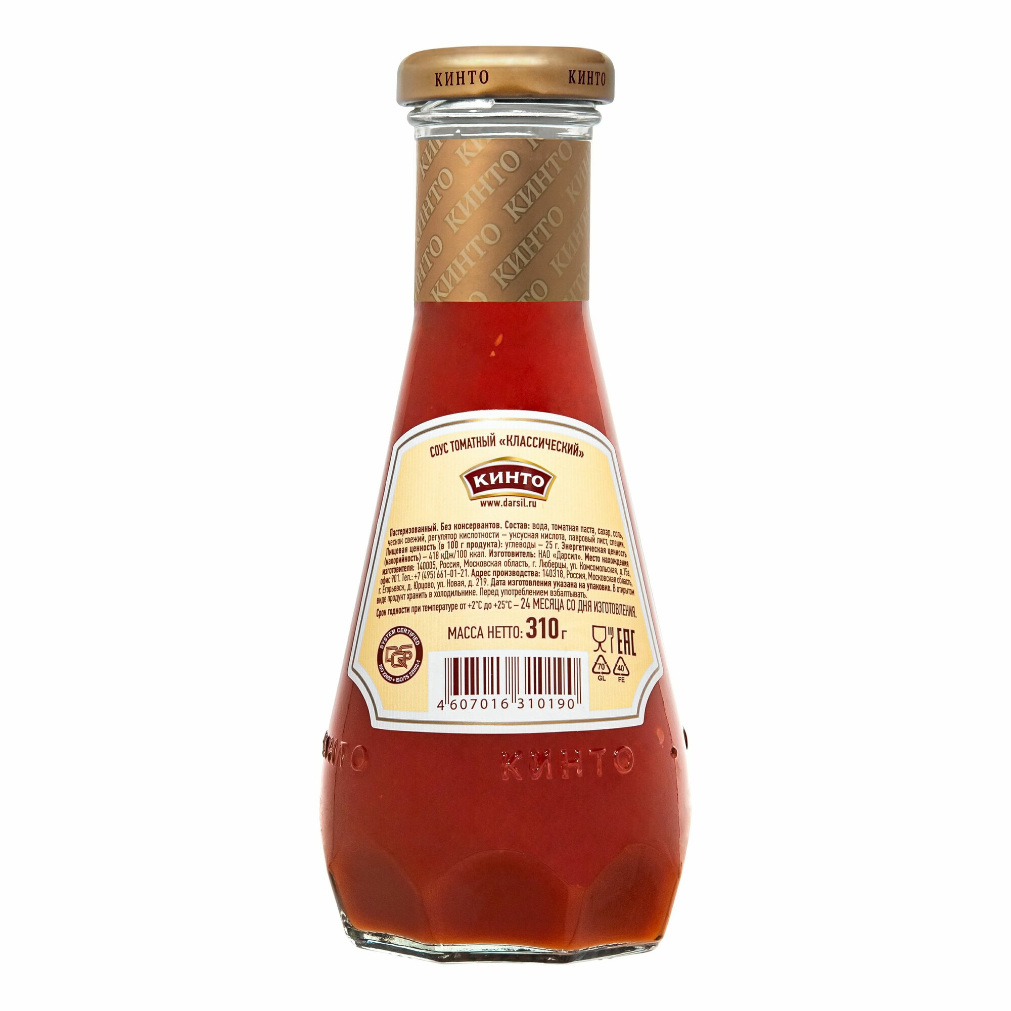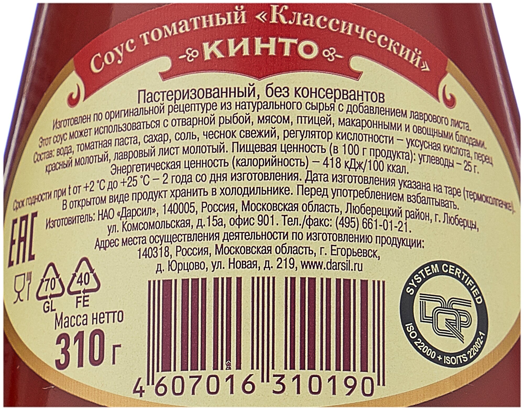 Состав: вода, паста томатная, сахар, соль, чеснок свежий, регулятор кислотности - уксусная кислота, перей красный молотый, лавровый лист молотый. Перед употреблением взбалтывать. В открытом виде продукт хранить в холодильнике. Пищевая ценность в 100г: углеводы - 25г. Энергетическая ценность: 100 ккал. Хранить при температуре от +2 до +25'С. Срок годности 2 года. ТУ 9162-004-53756910-2010. Производитель: ЗАО Дарсил 140005 Россия Московская обл. Люберецкий р-он г. Люберцы ул. Комсомольская д15а
