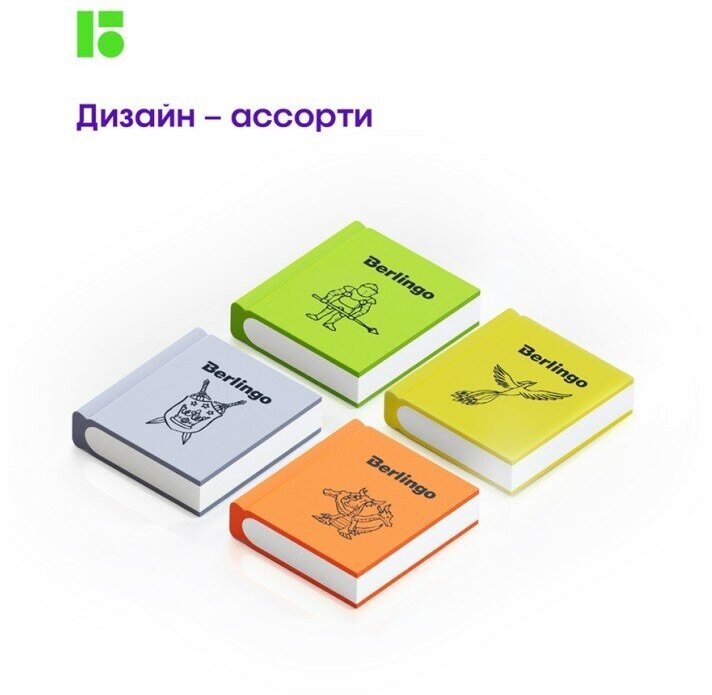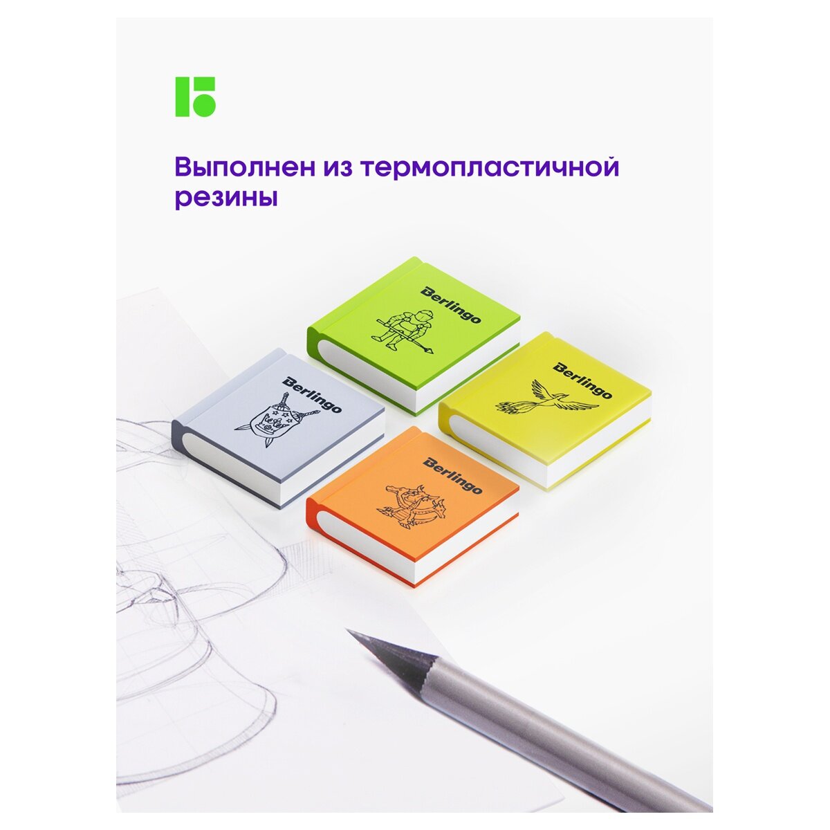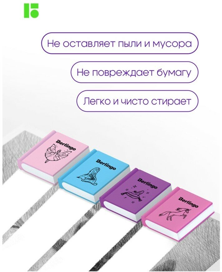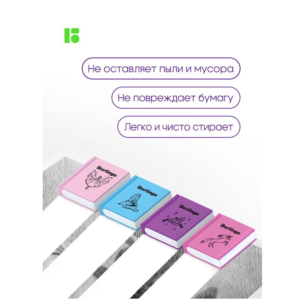 Ластики Berlingo "Fairy Tales" выполнены из высококачественной термопластичной резины.Не токсичны. Прекрасно справляются с линиями от чернографитного карандаша, не оставляют следов и грязных разводов после себя. Не повреждают бумагу. Два варианта дизайна : для мальчиков и для девочек.Упакованы в пакет с европодвесом. 4 цвета ассорти.