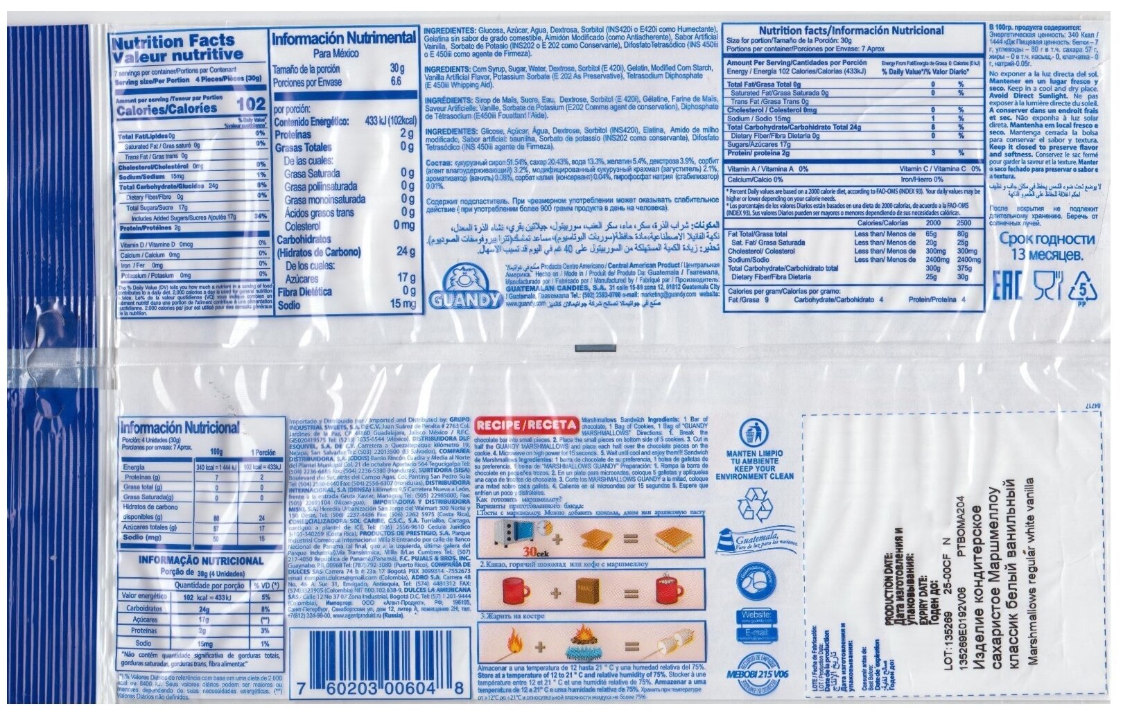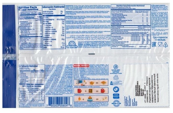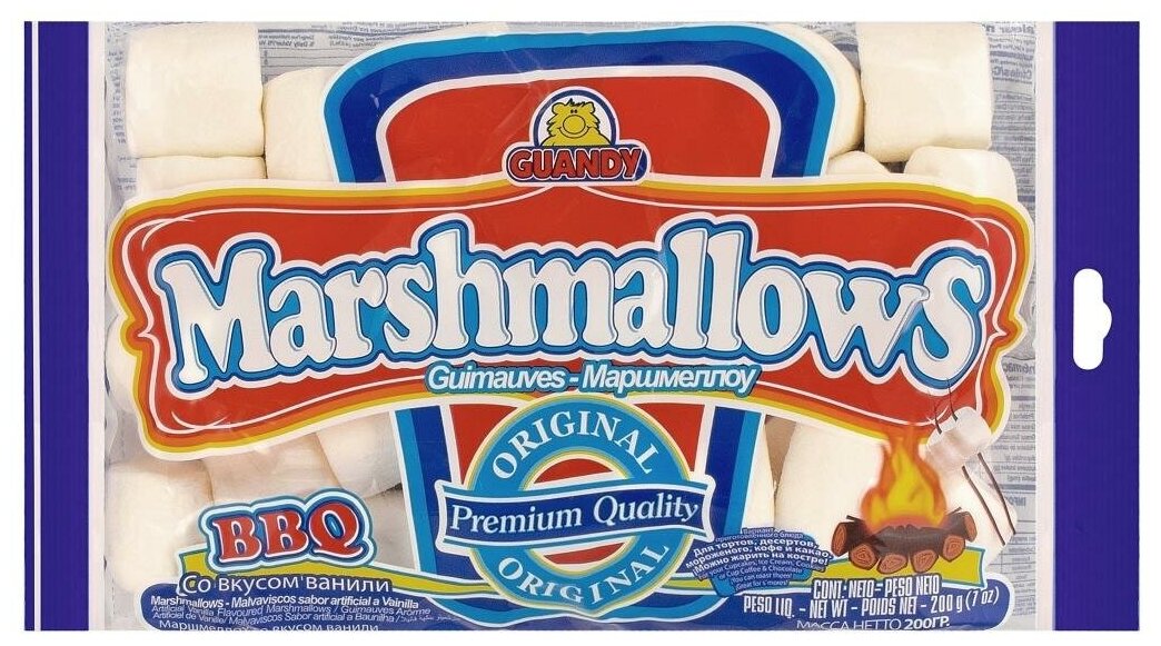 Без жира. Без глютена. Без лактозы. Без яичного белка. Маршмеллоу GUANDY сложный и уникальный продукт, имеющий особую закрытую технологию производства, которая включает в себя рецептуру и опыт в данной отрасли на протяжении более 35 лет. Не каждый производитель маршмеллоу способен повторить особую температурную формулу, а ведь именно она позволяет нам использовать маршмеллоу множеством разных интересных и вкусных способов, а также придает ему идеальную упругость и нежный ванильный вкус. Кроме того, наш маршмеллоу не содержит жир, глютен, лактозу и яичный белок. Технология производства маршмеллоу GUANDY разработана специально для России, учитывает наши климатические особенности и соблюдает все требования к такому нежному продукту! Поэтому именно наш маршмеллоу идеально жарится на огне и плавится при тепловой обработке, максимально долго сохраняет свою мягкость и упругость даже после вскрытия упаковки, а также создает самую стойкую и нежную ванильную пенку при использовании в напитках. Среди европейских сладостей маршмеллоу GUANDY уже много лет занимает лидирующие позиции компания GUANDY ведущий производитель маршмеллоу в мире. Производство маршмеллоу GUANDY является гипоаллергенным. Это значит, что на нем не используются аллергенные продукты: орехи, яйца, пшеничная мука, ракообразные и многие другие следовательно, нет никакого риска случайного попадания аллергенов и их следов в маршмеллоу. Важно помнить, что маршмеллоу не зефир! Ни один зефир не подходит для жарки на костре. Никакой вид зефира не ведет себя при тепловой обработке так, как маршмеллоу при жарке он сверху покрывается румяной корочкой, а внутри становится кремовым с неповторимым нежным ванильным вкусом. Именно поэтому, если вы хотите приготовить маршмеллоу на костре или углях, запечь его в гриле или добавить в напитки, чтобы получить нежное ванильное облако вам подойдет только настоящий маршмеллоу, и никакой зефир не сможет его заменить! Классический мягкий ванильный маршмеллоу, который можно жарить на костре, плавить в духовке или микроволновой печи, есть прямо из пачки, готовить с ним фондю или тосты, надевать на палочки с любимыми фруктами и жарить на костре. Это отличный способ организовать детский досуг и провести время с семьей за приготовлением интересных кулинарных вкусностей с использованием маршмеллоу в качестве ингредиента.