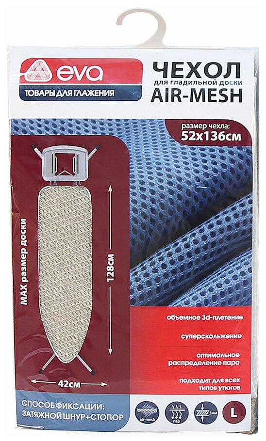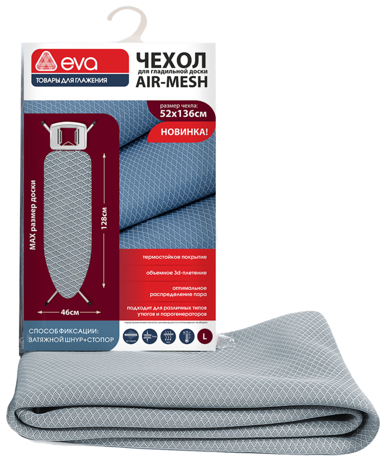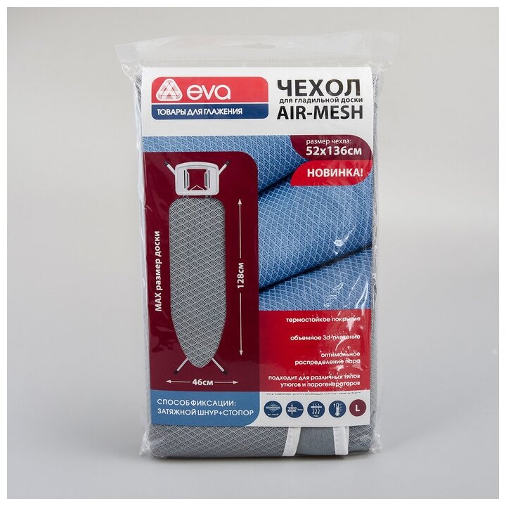 Описание товара:Чехол для гладильной доски Eva Air-mesh, термостойкий. Артикул: E125 Термостойкое покрытие. Объёмное 3D-плетение. Оптимальное распределение пара. Подходит для различных типов утюгов и парогенераторов. Способ фиксации: затяжной шнур + стопор. Чехол изготовлен с помощью объёмного 3D-плетения. Такой способ плетения позволяет создать внутри чехла систему паровых каналов и ячеек для оптимального распределения температуры, эффективного отпаривания и облегчения процесса глажения. При отпаривании между вещами и чехлом гладильной доски создается тонкая воздушно-паровая прослойка, гарантирующая до 2-х раз более бережное и эффективное глажение (По сравнению с остальными чехлами для гладильных досок ТМ "ЕВА"). Может использоваться с различными типами утюгов и парогенераторов, работающие при температуре не более 200°С (температурный режим указан согласно ГОСТ ISO 3578-2014).Состав товара:Полиэстер 100%.Меры предосторожности:Срок годности не ограничен. Обязательной сертификации и декларированию не подлежит. Соблюдайте рекомендации по уходу, указанные на ярлыках изделий. При выборе чехла учитывайте, что его размер должен быть больше размера покрытия доски минимум на 5 см. Рекомендуется заменять чехол не реже 1 раза в 3 года.