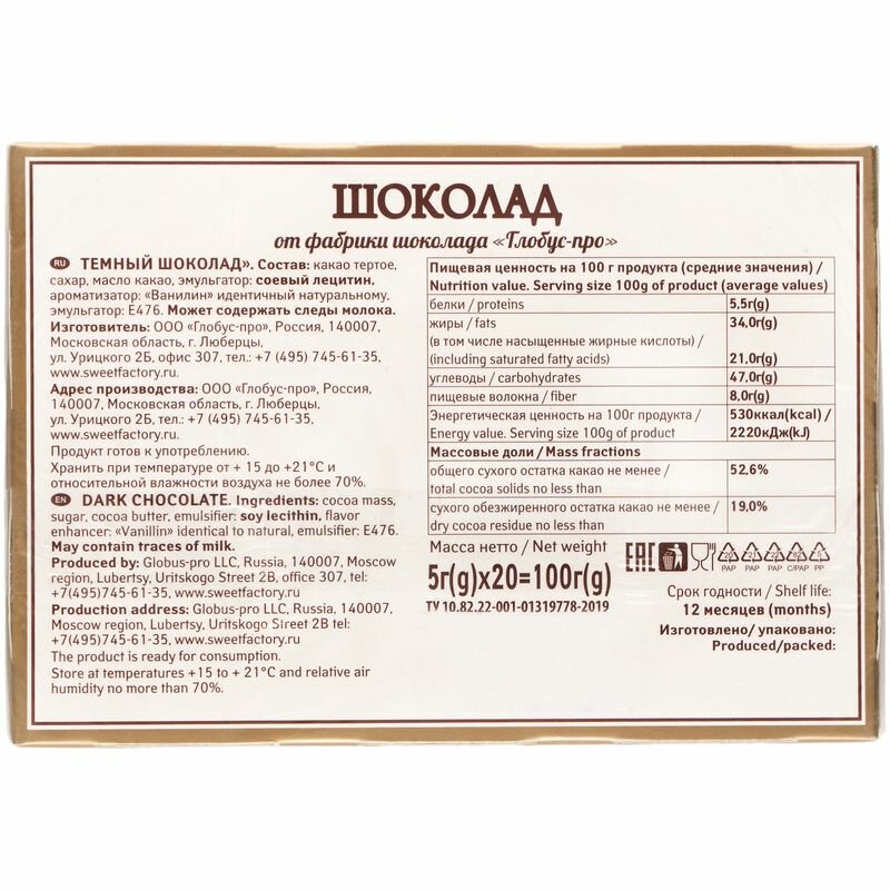 Состав: какао тертое, сахар, масло какао, эмульгатор: соевый лецитин, ароматизатор: Ванилин идентичный натуральному, эмульгатор: Е476. Массовые доли: общего сухого остатка какао – не менее 52,6%, сухого обезжиренного остатка какао – не менее 19,0%.