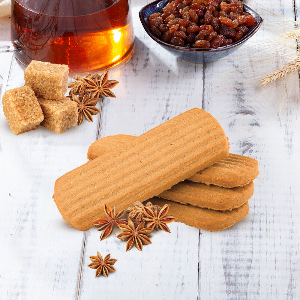 Нежное, хрустящее печенье с тростниковым сахаром. Оригинальный пряный вкус создают добавленные в состав молотый имбирь, корица, мускатный орех и гвоздика. Уникальные предсказания внутри.