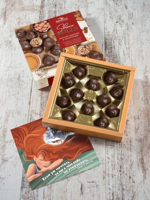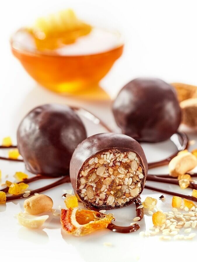 | Состав | Шоколадная глазурь (сахар, какао тертое, эквивалент масла какао, какао-порошок, лецитин соевый (натуральный эмульгатор), натуральный ароматизатор ванилин), арахис жареный дробленый, изюм, цукаты апельсина, мёд натуральный, экстракт розмарина. |