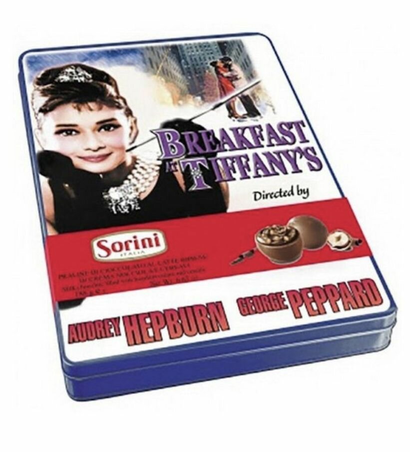 Конфеты Sorini Breakfast at Tiffany's - итальянское лакомство для всей семьи. Конфеты расфасованы в коробку, украшенную принтом с афишей классического фильма "Завтрак у Тиффани". Их элегантный вкус и мягкая сладость полностью соответствуют названию.Конфеты Сорини "Завтрак у Тиффани" изготовлены из молочного шоколада высочайшего качества, они содержат только натуральные ингредиенты. Оболочка из шоколадной глазури скрывает в себе нежный ореховый крем и кусочки дробленого фундука. Конфеты станут наилучшим завершением романтического ужина или праздничной трапезы.