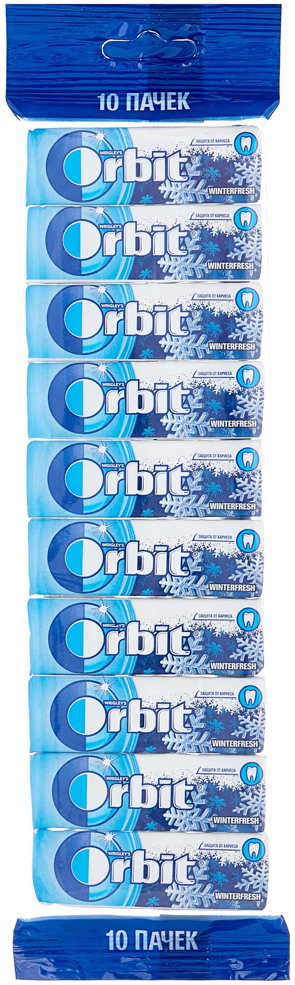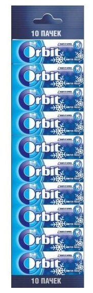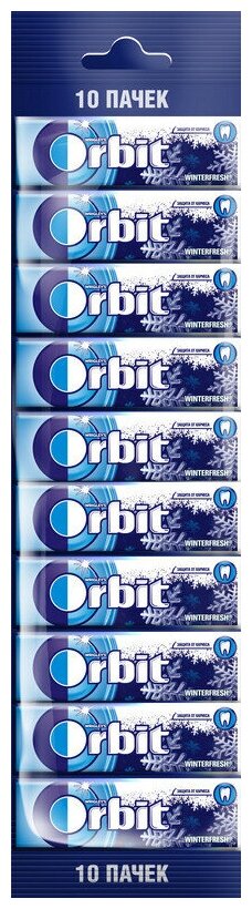 Orbit / Орбит жевательная резинка, Winterfresh, Мультипак, 10шт. Избавиться от неприятного запаха изо рта после употребления напитков и еды поможет жевательная резинка Orbit Winterfresh с ярким и охлаждающим ментоловым вкусом. Буквально пара жевательных драже ? и морозная свежесть вам обеспечена! Orbit Winterfresh выгодно выделяется среди других жевательных резинок тем, что долго сохраняет свой вкус. В любой ситуации чувствуй себя уверенно вместе с Orbit! Всего в упаковке 10 штук.