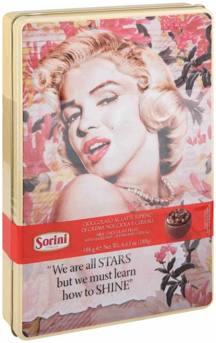 Стильная жестяная коробка шоколадных конфет станет изысканным подарком для женщин и мужчин. Особенно для поклонников прекрасной Мэрлин Монро, высказывание которой нанесено на крышке коробки: "Мы все звезды, но мы должны научиться сиять". Наслаждайтесь сладостью этих конфет и сияйте! Изображение на крышке объемное. Конфеты из молочного шоколада с нежной кремовой начинкой, в которую добавлены орехи. Всего в коробке 16 конфет, обернутых фольгой.