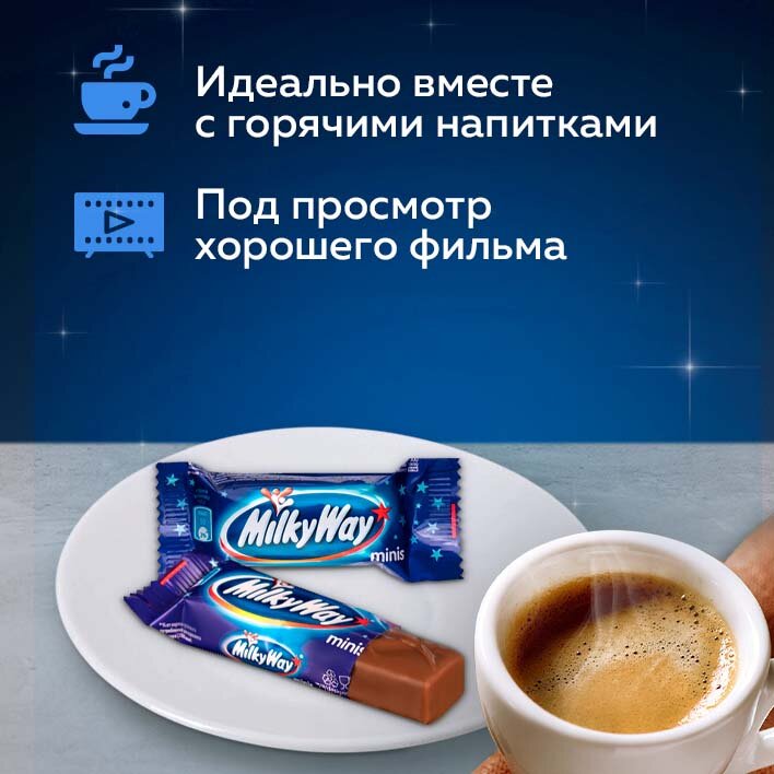 Milky Way Minis / Милки Вей Минис развесные конфеты, Суфле, Коробка, 1кг. Целый килограмм любимого лакомства в коробке развесных конфет Milky Way порадует любого сладкоежку, как маленького, так и взрослого. Нежная нуга со сливочным вкусом, покрытая качественным шоколадом, буквально тающим во рту, идеально подходит для перекуса под чашечку ароматного кофе или какао.