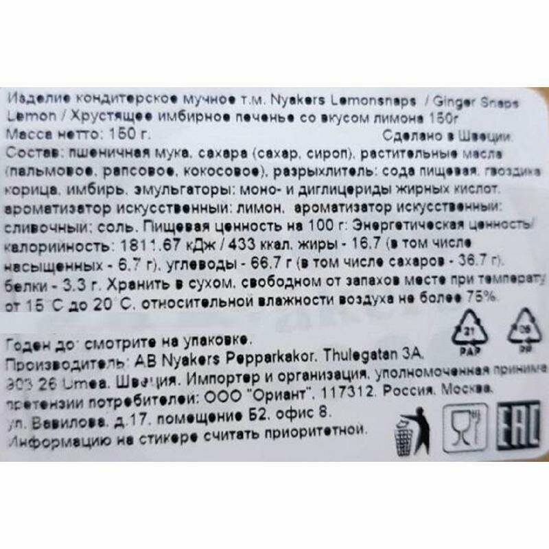 Шведская семейная компания Nyakers Pepparkakor, существующая с 1952 года, в настоящее время является одной из крупнейших на шведском рынке имбирного печенья. Ее продукция экспортируется в страны по всему миру. Попробуйте ароматное и восхитительно вкусное имбирное печенье со вкусом апельсина - и Вам обязательно понравится. Специи в их составе идеально сбалансированы, и печенье имеет приятную хрустящую корочку, которая, несомненно, порадует даже самых изысканных гурманов. А тонкий и нежный аромат апельсина добавит красок к классическому вкусу имбирного печенья премиум качества.