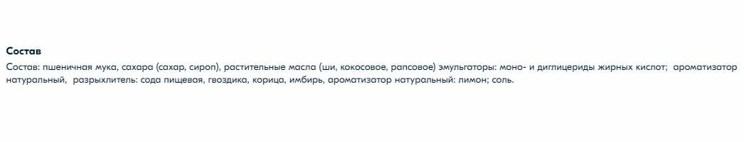 | Состав | пшеничная мука, сахара (сахар, сироп), растительные масла (пальмовое, рапсовое, кокосовое), разрыхлитель |