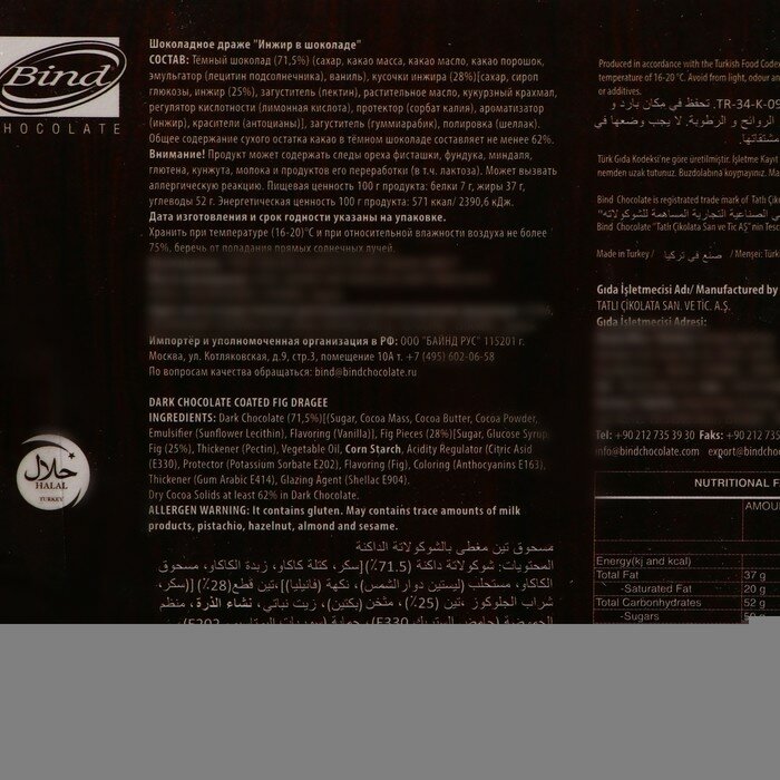 | Состав | Тёмный шоколад (71,5%)[( сахар, какао масса, какао масло, какао порошок, эмульгатор (лецитин подсолнечника), ваниль], Инжир (28%), Глазурь (гуммиарабик, шеллак) .Общее содержание сухого остатка какао в тёмном шоколаде составляет не менее 55% |