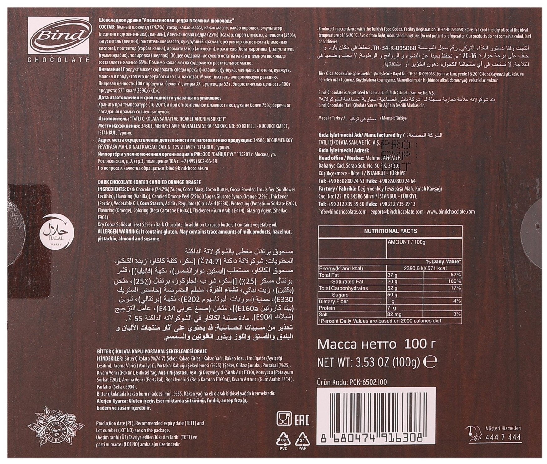 | Состав | Темный шоколад (%74,7) сахар, какао тертое, какао-масло, эмульгатор (лецитин растительный), ароматизатор (ванилин), (содержание сухого какао не менее %65.) Апельсиновые цукаты (%25), стабилизатор (Е 414), глазурь (Е 904) |