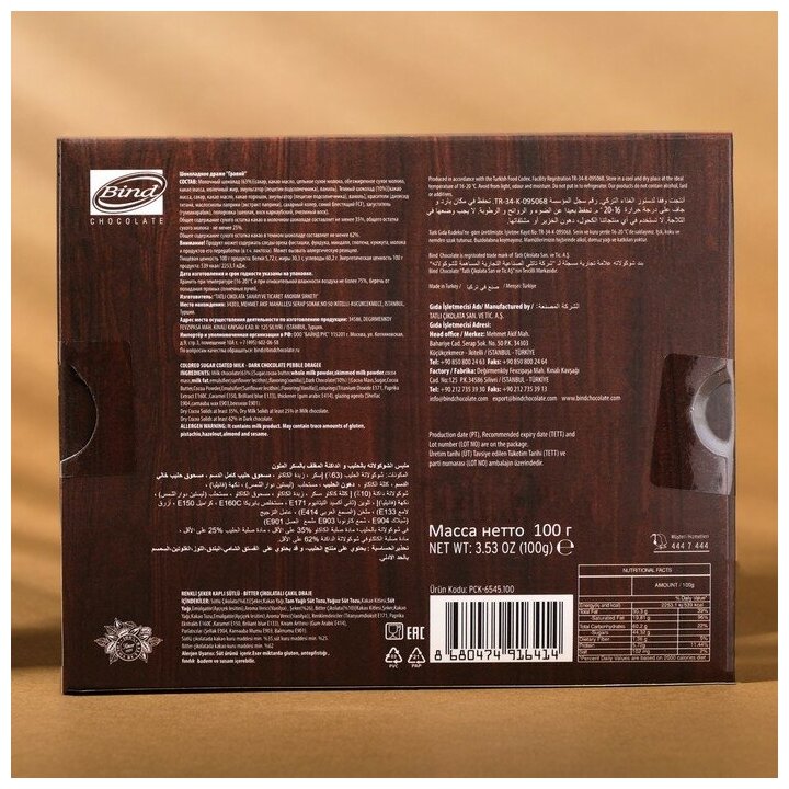 Шоколадное драже Бинд Гравий 100 г - это ассорти шоколад с весом 100 грамм, содержащий нежный шоколадный вкус и начинку. Конфеты имеют высокое содержание углеводов (50 г на 100 г), но при этом богаты белками (4 г на 100 г) и необходимыми жирами (35 г на 100 г). Они особенно привлекательны для тех, кто предпочитает продукты без глютена. Содержание энергии составляет 538 ккал на 100 г. Драже выполнено в виде дражированных шариков из темного шоколада с фисташками и изюмом, создавая уникальную текстуру и неповторимый вкус.
