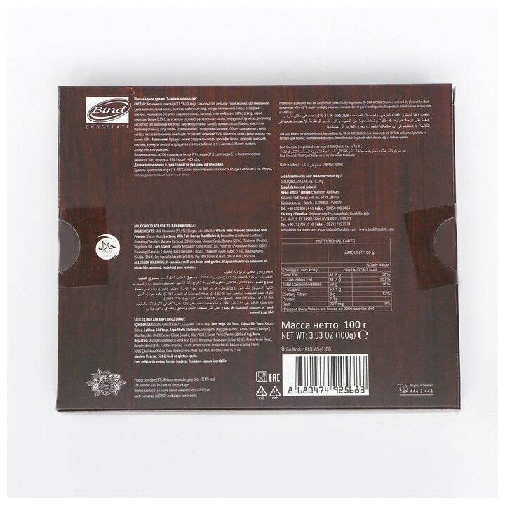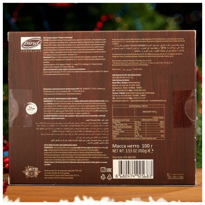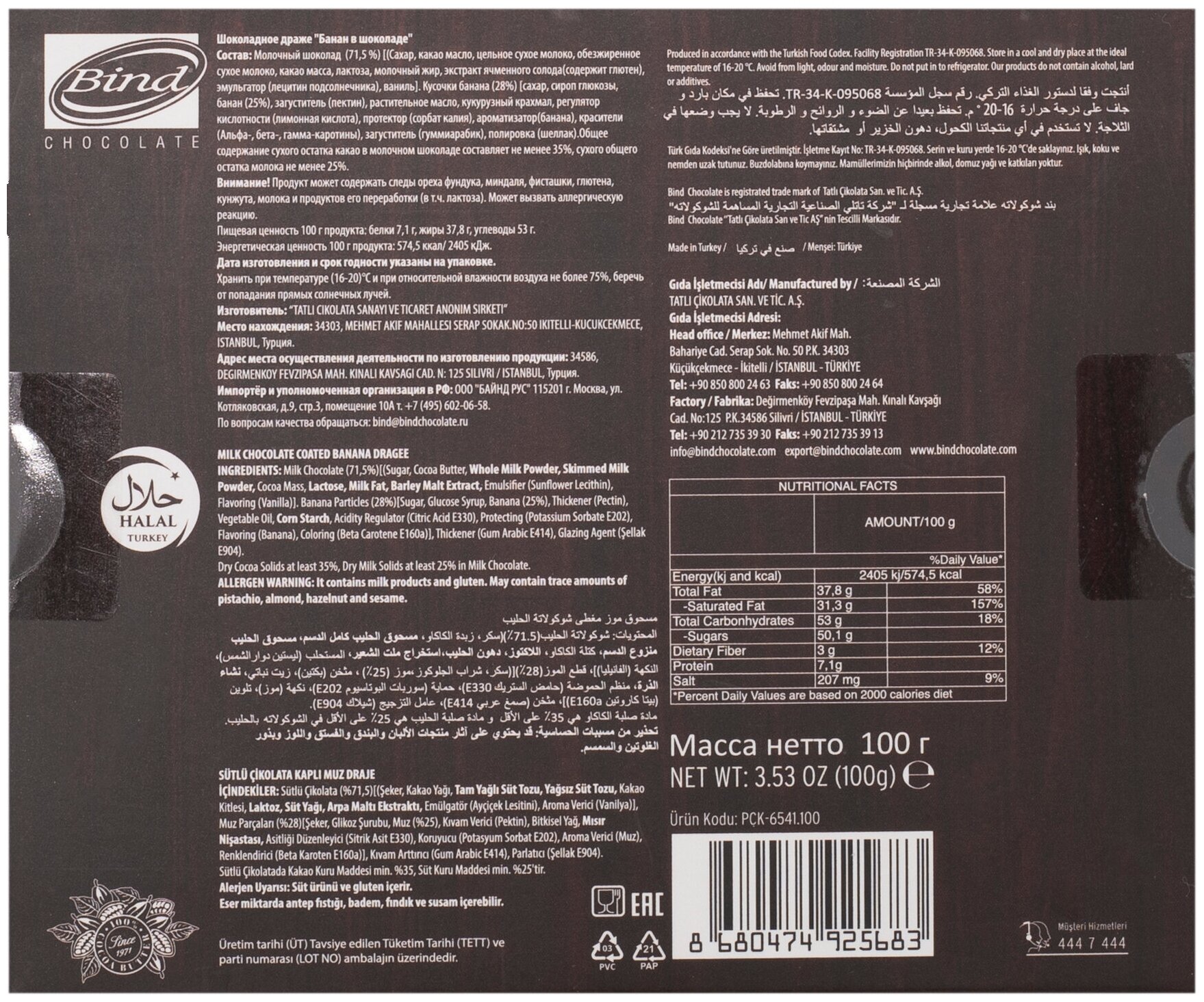 6531595 Драже "Банан в шоколаде" шоколад, 100 г Шоколадное драже, банан в молочном шоколаде от Bind Chocolate это изумительный вкус и идеальный комплимент на любые случаи жизни. Изящный набор прекрасно дополнит основной презент, а также послужит самостоятельным вариантом, который по достоинству оценят поклонники шоколадных конфет. С ними ваше чаепитие станет особенно вкусным и приятным, поможет отвлечься от повседневной суеты и погрузиться в мир грез и фантазий!