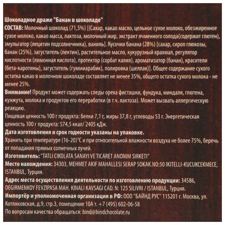 | Состав | Молочный шоколад (71,5 %) (Cахар, какао масло, цельное сухое молоко, какао масса, лактоза, молочный жир, экстракт ячменного солода(содержит глютен), эмульгатор (лецитин подсолнечника), ваниль, банан (28,5%), красители (гуммиарабик, шеллак).Общее содержание сухого остатка какао в молочном шоколаде составляет не менее 35%, сухого общего остатка молока не менее 25% |