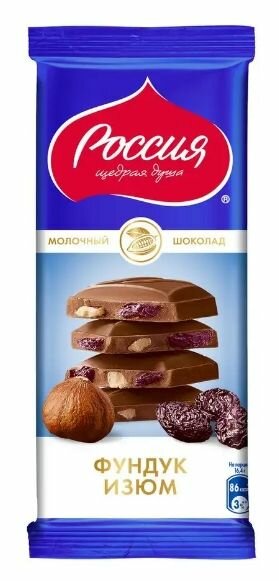 Шоколад Россия - щедрая душа молочный с фундуком и изюмом 82г
