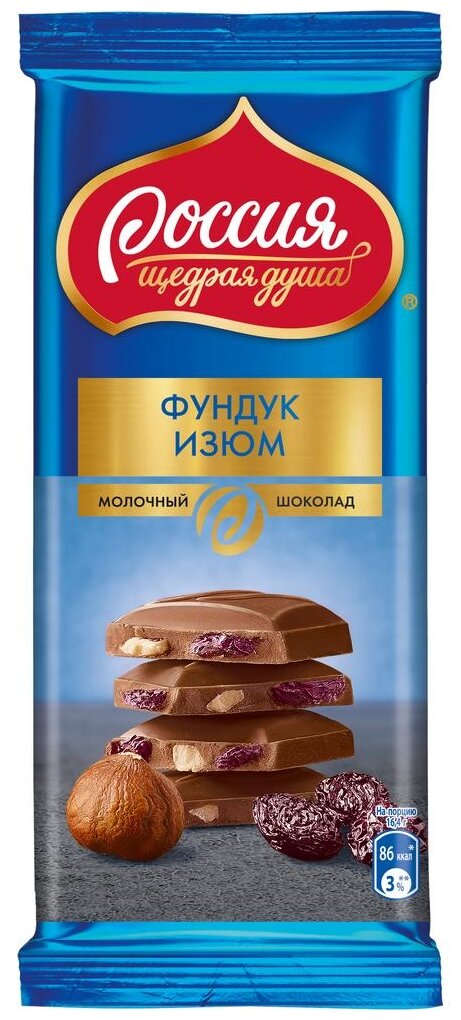 Сложно пройти мимо невероятно популярного сочетания отборного обжаренного фундука и сочного изюма в шоколаде "Россия" - Щедрая душа! Молочный шоколад с фундуком изюмом. Простое, но невероятно вкусное сочетание бархатистого молочного шоколада, отборных качественных ингредиентов и аппетитной форма шоколада - обещают сладкое гастрономическое удовольствие, а современный яркий дизайн упаковки порадует ваш взгляд.