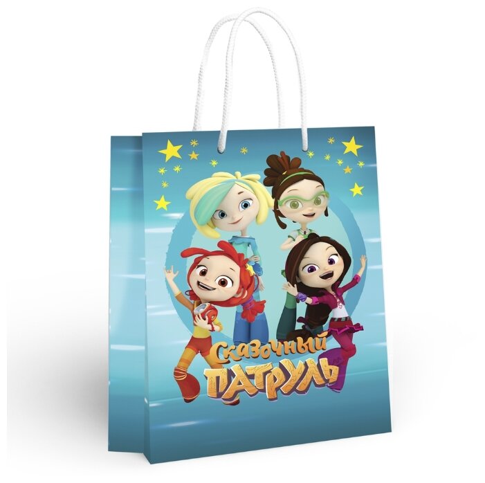 Подарочный бумажный пакет, изготовленный из плотной мелованной бумаги (130 г/м), с изображением персонажей популярного мультфильма «Сказочный патруль» поможет Вам, он станет прекрасным дополнением к будущему подарку.