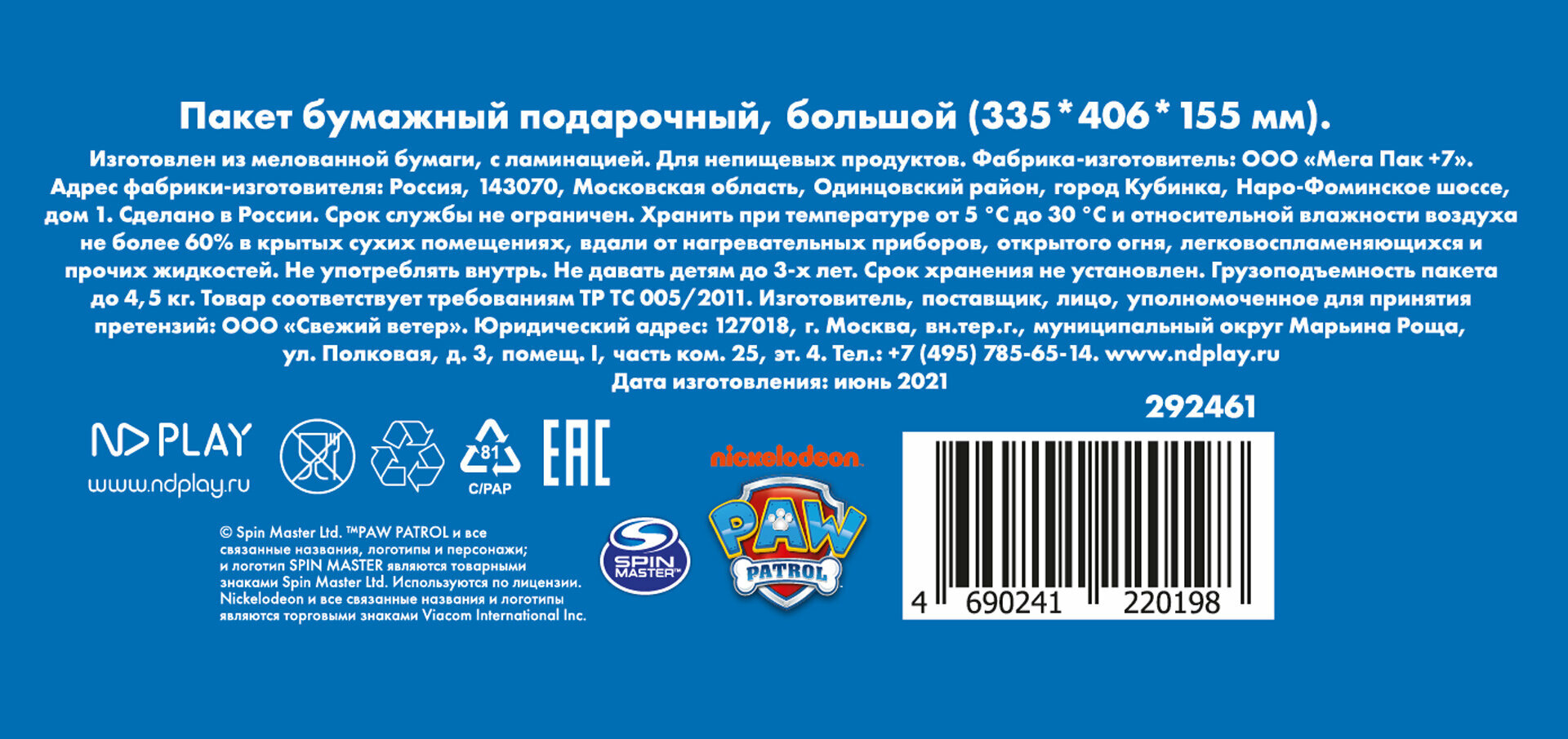 Большой подарочный пакет (335*406*155 мм) для поклонников мультсериала «Щенячий патруль»! Подарочный пакет «Щенячий патруль» с изображением отважных щенков идеален для упаковки подарков девочке или мальчику на Новый год, день рождения или другой праздник. Голубой пакет подходит для упаковки новогодних подарков из серии «Щенячий патруль». Подарочный пакет отличается вместительностью, удобными ручками, привлекает внимание ярким дизайном и гладкой мелованной бумагой с ламинацией. Пакет подарочный бумажный – красивое и практичное решение для упаковки детских подарков.