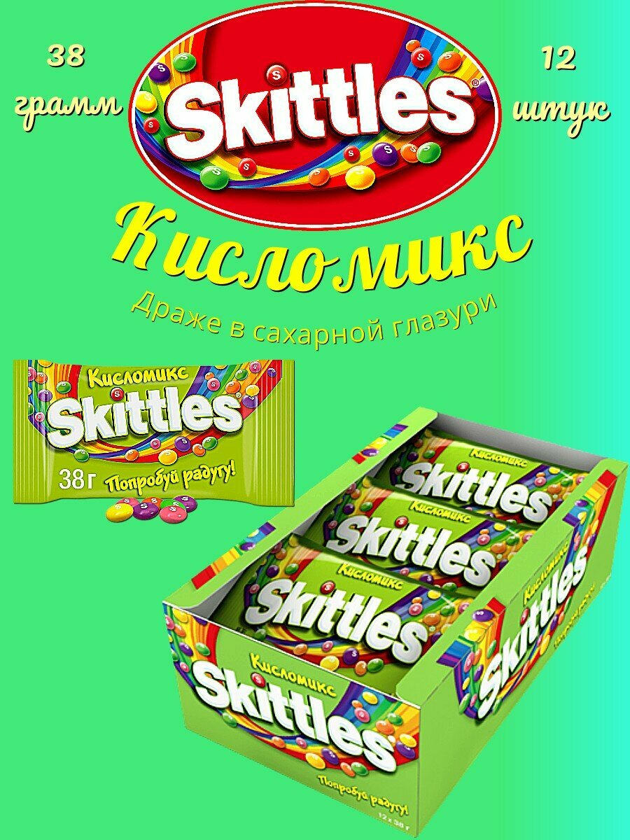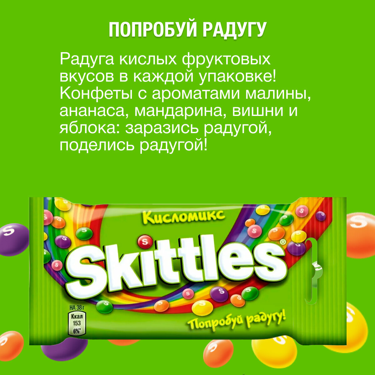 Skittles Кисло микс - потрясающе кислые драже с хрустящей оболочкой, жевательной серединой и радугой терпких фруктовых вкусов.- Кисло микс - это возможность поделиться сладостью с друзьями, семьей или коллегами по работе. - Возьмите драже Skittles в дорогу или пополните свои домашние или офисные запасы сладостей.- Отлично подходит для вечеринок по случаю дня рождения, больших посиделок с друзьями или за просмотром хорошего фильма.- Skittles наполнит вас радугой кислых вкусов: ананас, малина, яблоко, мандарин и вишня. Не бывает двух одинаковых радуг, как и двух одинаковых пачек Skittles, поэтому каждый раз наслаждайтесь вкусным и необычным сочетанием.