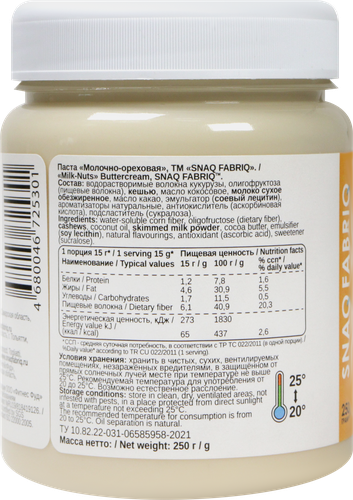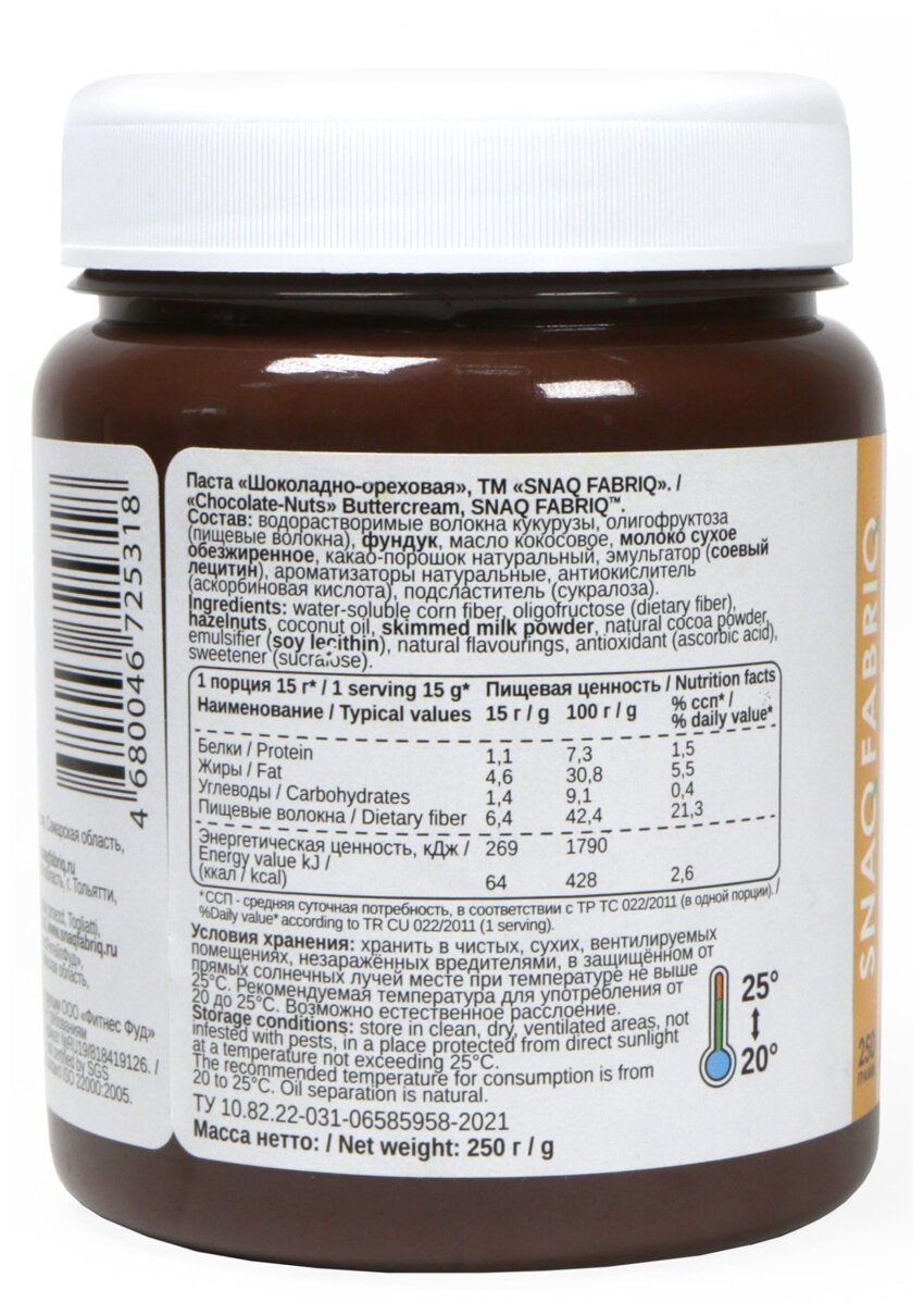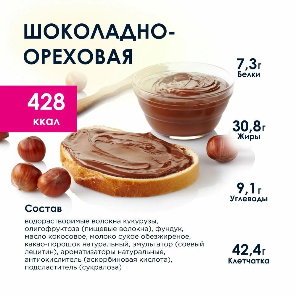 Состав: водорастворимые волокна кукурузы, олигофруктоза (пищевые волокна), фундук, масло кокосовое, молоко сухое обезжиренное, какао-порошок натуральный, эмульгатор (соевый лецитин), ароматизаторы натуральные, антиокислитель (аскорбиновая кислота), подсластитель (сукралоза)