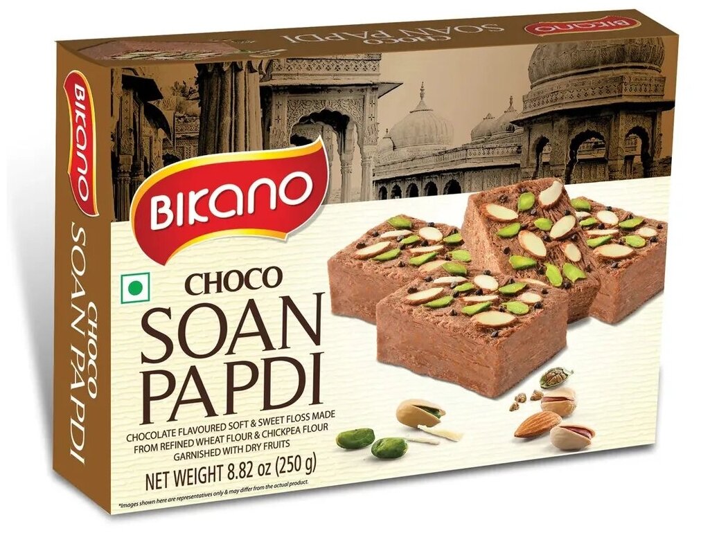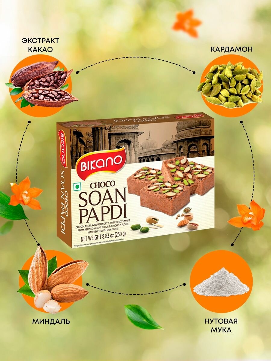 Халва с орехами "Соан Папди Чоко" (Soan Papdi Choco) Bikano | Бикано 250г - натуральная сладость, приготовленное по традиционному рецепту из нутовой и пшеничной муки с добавлением какао, состоящее только из натуральных растительных компонентов.Полезные составляющие: Нут снижает уровень “плохого” холестерина крови и триглицеридов, уменьшает риск сердечно-сосудистых заболеваний. Нормализует кровяное давление, помогает выработке эритроцитов, поддерживает здоровье костей и суставов. Натуральный растительных белков, хорошо и надолго утоляет голод, поддерживает иммунитет и насыщает антиоксидантами. Какао богато железом и магнием, улучшает кроветворение и кровоснабжение сосудов. Нормализует работу нервной системы, способствует снижению уровня стресса и тревожности, уменьшает раздражительность. Восстанавливает силы после умственных и физических перегрузок. Повышает настроение, улучшает кровообращение, придает лакомству сладковатый пряный аромат. Результат применения: Сладкое дополнение к приему пищи, дарящее насыщение надолго. Поддержка здорового уровня холестерина и сахара крови. Очищение организма от токсинов. Усиление работоспособности и выносливости. Улучшение настроения и заряд энергии. Заказать халву с орехами "Соан Папди Чоко" (Soan Papdi Choco) Bikano | Бикано 250г, а также другие традиционные индийские сладости, натуральные специи и приправы из Индии, вы можете в нашем интернет-магазине органических товаров “Ashaindia Способ применения: Халва готова к употреблению. Подходит для употребления в качестве самостоятельного блюда или десерта.Противопоказания: Непереносимость компонентов состава, язва желудка и 12-типерстной кишки, варикоз, заболевания глубоких вен.Состав: Сахар, сливочное масло, нутовая и пшеничная мука, какао, обезжиренное сухое молоко, кардамон, миндаль, фисташки.