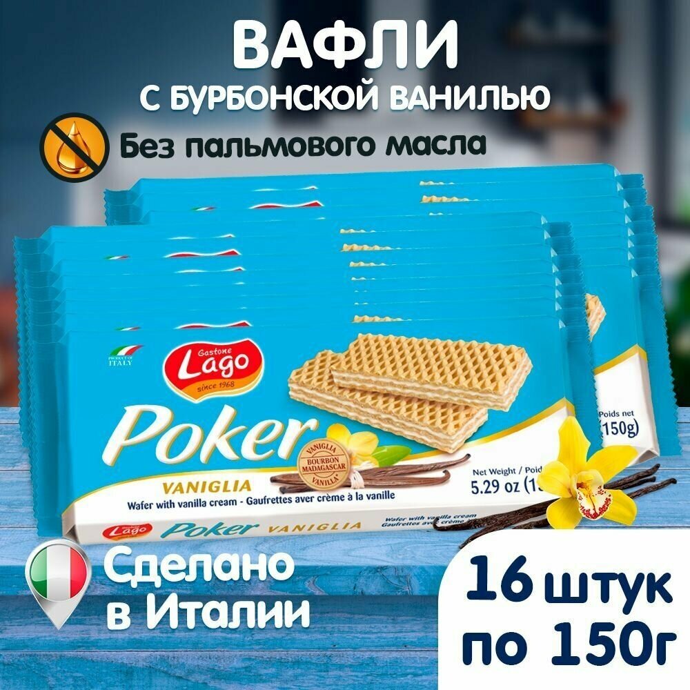 Бурбонская ваниль в составе вафель Gastone Lago Poker считается лучшим сортом ванили в мире. Она имеет насыщенный, сливочный вкус с ошеломляющим сладким, маслянистым ароматом. Ванильные вафли изготовлены итальянской компанией Gastone Lago, которая является одним из крупнейших европейских производителей кондитерских изделий и радует своими десертами гурманов по всему миру с 1968 года. Gastone Lago использует самые современные технологии и лучшие ингредиенты. В составе нет пальмового масла, оно заменено на кокосовое. Качество ванильных вафель соответствует стандартам IFS, HALAL, KOSHER. Итальянские вафли с ванилью не содержат ГМО и консервантов. Вафли с бурбонской ванилью идеально подойдут в качестве сладкого перекуса, к чаю или кофе и в качестве ингредиента для десертов. Насладитесь потрясающим вкусом изысканных итальянских вафель
