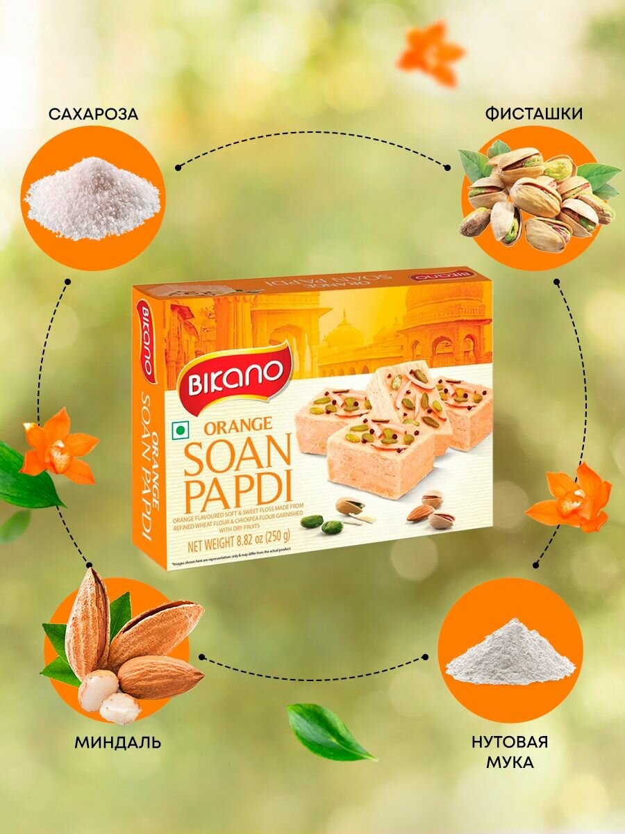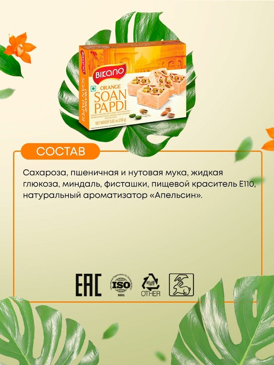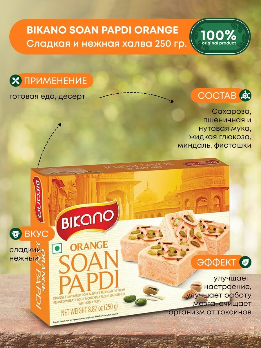 Ароматная и нежная халва с орехами "Соан Папди Оранж" Soan Papdi Orange от Bikano | Бикано 250г - прекрасный источник сил и энергии на весь день. Идеально подходит для завтрака и быстрого перекуса. Орехи и нотки апельсина придают продукту насыщенный вкус и яркий свежий аромат. Ценные составляющие: Нут снижает и поддерживает уровень холестерина крови, улучшает работу желудочно-кишечного тракта. Является сильнейшим антиоксидантом, способствует очищению организма от шлаков и токсинов. Защищает от развития рака, артрита, атеросклероза, сахарного диабета. Предотвращает заболевания коронарной артерии, снижает риск инфарктов, инсультов и других заболеваний сердца и сосудов. Пшеница улучшает когнитивные функции, помогает концентрировать внимание, стимулирует работу нервной системы. Способствует восстановлению после повышенных нагрузок. Снижает артериальное давление и облегчает течение бронхиальной астмы за счет теобромина. Апельсин благоприятно действует на нервную систему, стимулирует выработку эндорфина, улучшает настроение и работоспособность. Результат применения: Питательный и полезный перекус без вреда для здоровья. Улучшение деятельности сердечно-сосудистой системы. Повышение жизненного тонуса и работоспособности. Поддержка и укрепление иммунной и нервной системы. Насыщение полезными элементами и растительными белками. Заказать халву с орехами "Соан Папди Оранж" от Bikano | Бикано 250г , а также другие продукты, специи и приправы для вегетарианского и диетического питания, вы можете в нашем интернет-магазине индийских товаров “Ашанти”.Способ применения: В качестве самостоятельного блюда и как дополнение к рациону.Противопоказания: Аллергия на составляющие компоненты, мочекаменная болезнь, язва желудка и двенадцатиперстной кишки, варикозное расширение вен.Состав: Сахароза, пшеничная и нутовая мука, жидкая глюкоза, миндаль, фисташки, пищевой краситель Е110, натуральный ароматизатор «Апельсин».