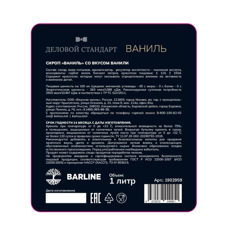 Сироп для кофе и коктейлей Barline Ваниль 1 литр – поистине культовый продукт и выделяется на фоне других видов сиропа своим неповторимым вкусом! Сироп для кофе и коктейлей можно применять в качестве топпинга в разных напитках, как в алкогольных, так и безалкогольных.Так же сироп можно добавлять в выпечку, кондитерские изделия и даже в фруктовые салаты. Утонченное качество этого сладкого напитка оценивают по достоинству опытные баристы, которые стремятся к усовершенствованию своих напитков. Сама бутылка сиропа, обладает хорошим дизайном. На этикетке можно найти информацию о том где был произведен сироп. Бутылка оснащена удобной герметичной крышкой, которая позволит удобно хранить бутылку после открытия 120 дней! А это значит, что вы целых 4 месяца сможете наслаждаться любимыми напитками!
