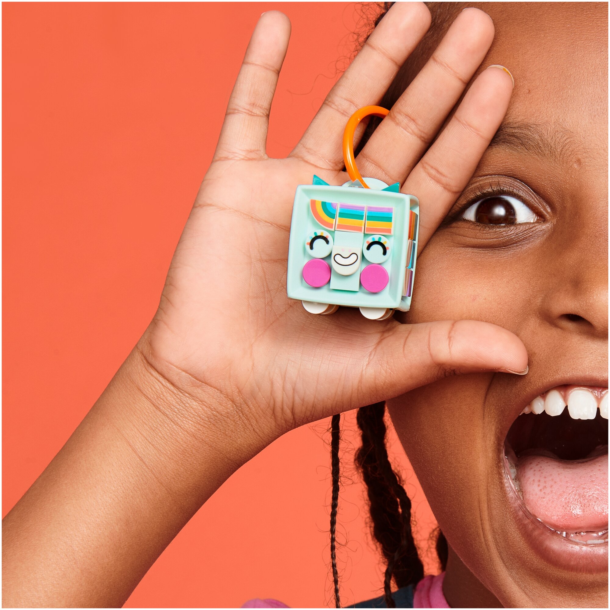 Повесьте себе на сумку веселого единорога! Придумайте дизайн крутого единорога с забавным выражением лица. Используйте тайлы, чтобы создать его пастельно-зеленый и радужный с блестками образ. Добавьте что-то новое с набором тайлов Dots (41931 — продается отдельно). Меняйте внешний вид брелока и переделывайте его, когда вам угодно. Когда останетесь довольны, прикрепите его на кольцо — и вперед!