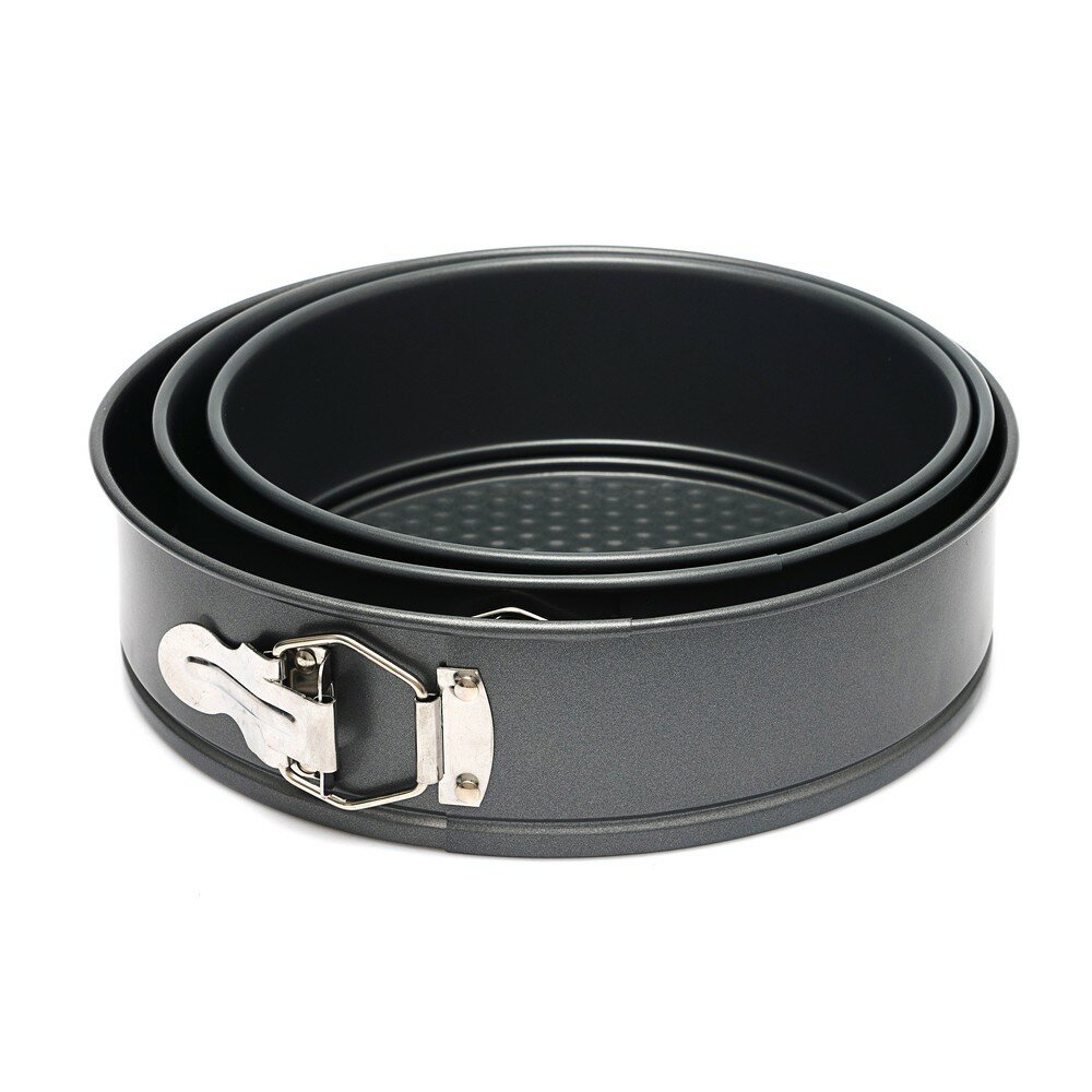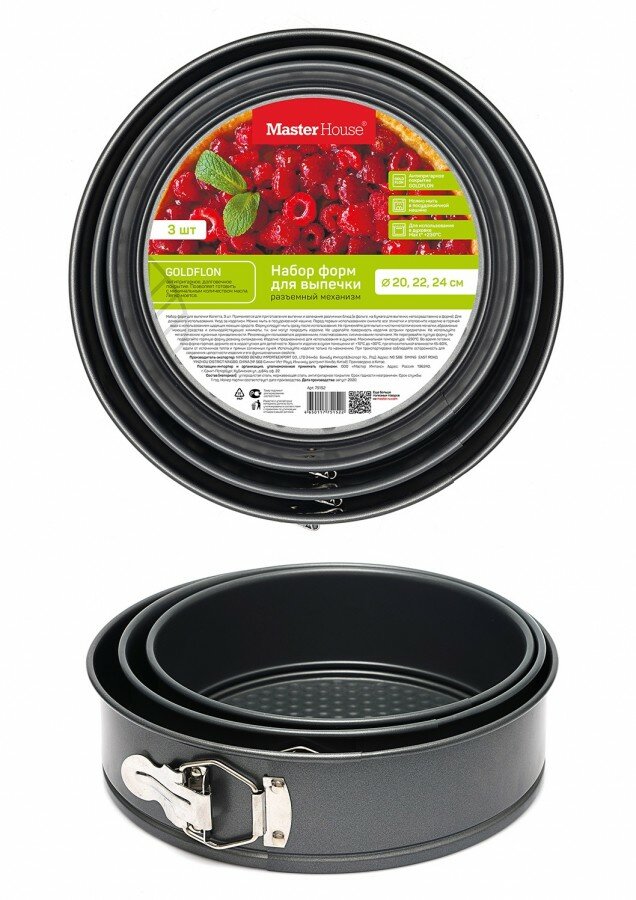 Набор разъемных форм для выпечки со съемным дном идеально подойдет для всех любителей выпечки. Для выпекания предварительно смажьте стенки небольшим количеством масла, а для жидкого теста предлагаем использовать пергамент или бумагу. Так как формы имеют разъемный механизм и съемное дно, вынимать из них выпечку очень легко. Рельефное дно идеально подойдет для приготовления песочного или бисквитного теста. Рекомендуем, готовое изделие отделять от бортиков только силиконовой или деревянной лопаткой, чтобы не повредить антипригарное покрытие GOLDFLON. Равномерный прогрев изделия. Высокий бортик. Можно мыть в посудомоечной машине. Для использования в духовке при температурах до 230 градусов. Размер: 20 см, 22 см и 24 см. Высота борта 6.6 см.