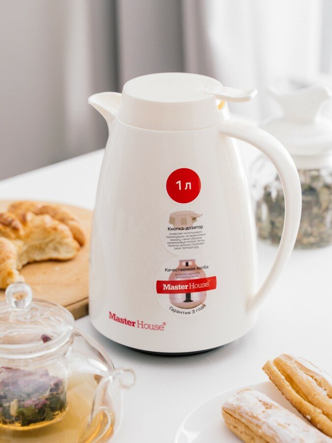 Термос-кувшин MASTER HOUSE Турин 1л пластик, стекло кнопка-дозатор цвет белый. Термокувшин 'Master House. Турин' 1 л - оптимальное решения для дома и офиса. Сохранит напитки горячими и вкусными. Чтобы налить жидкости ровно столько, сколько необходимо термокувшин снабжен кнопкой-дозатором на крышке.Турин кнопка-дозаторОбъем: 1 лТип: термос-кувшинМатериал: пластик/стеклоМатериал колбы: стекл