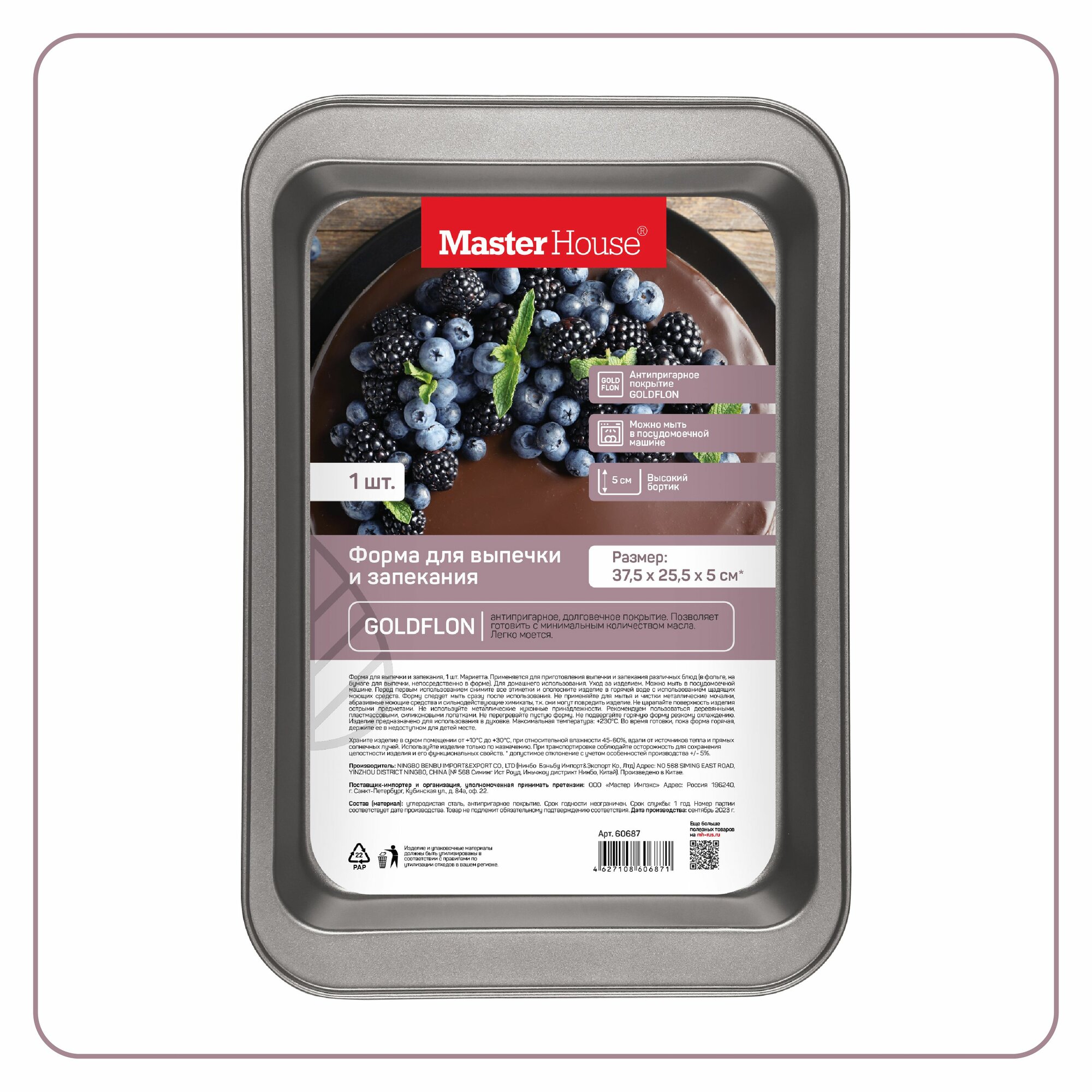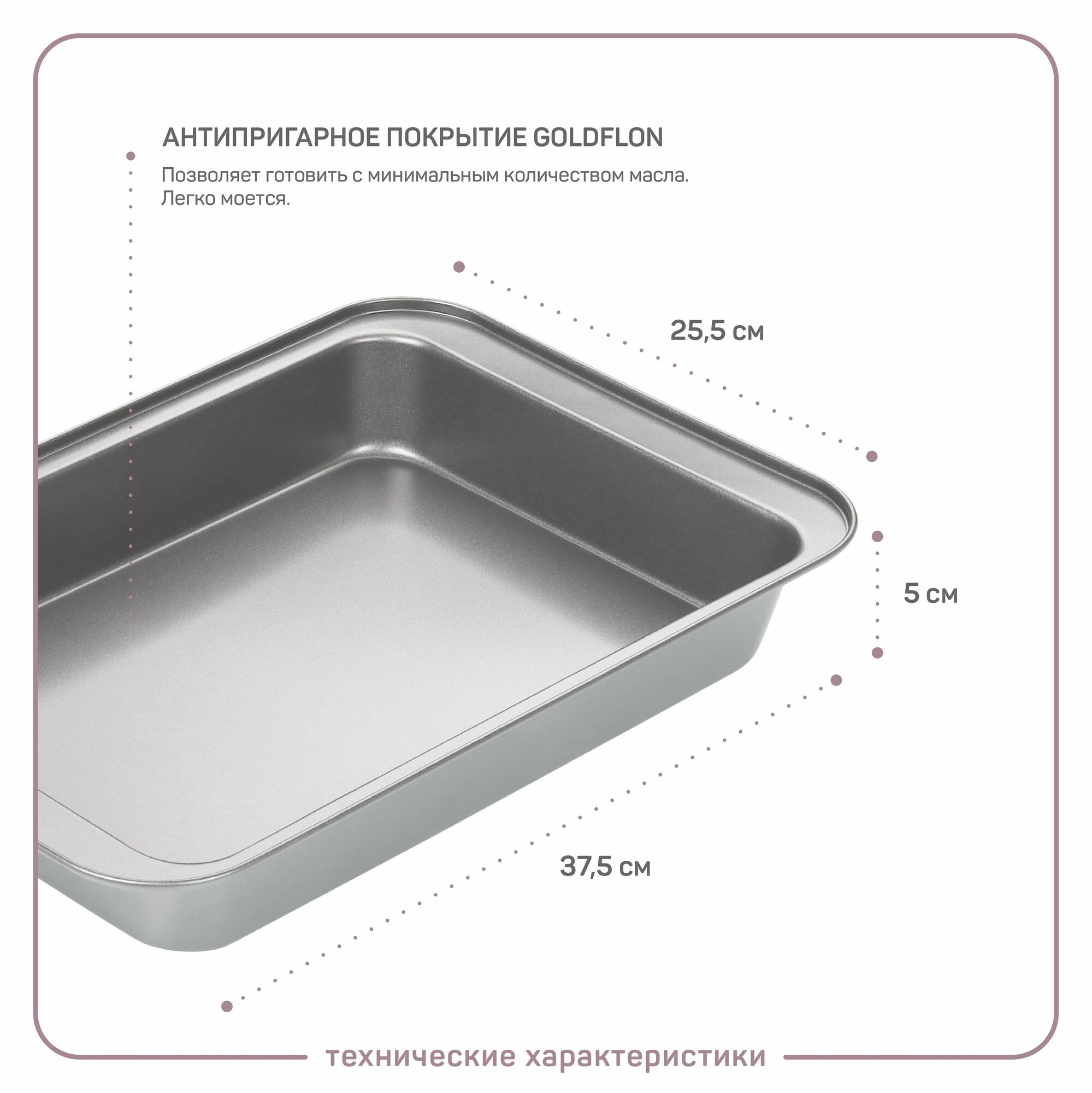 Форма для выпечки прямоугольная Мариетта. Размер: 37,5х25,5х5см. Высокий бортик! Равномерный прогрев изделия. Антипригарное покрытие GOLDFLON. Внешнее и внутреннее антипригарное покрытие для легкого ухода. Можно мыть в посудомоечной машине. Для использования в духовке (max t° +230°C).