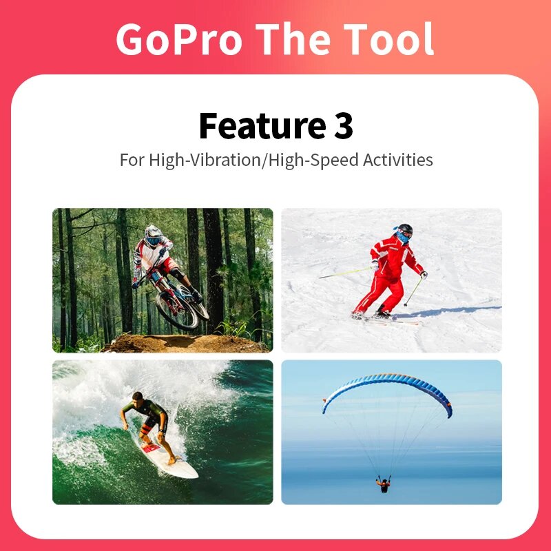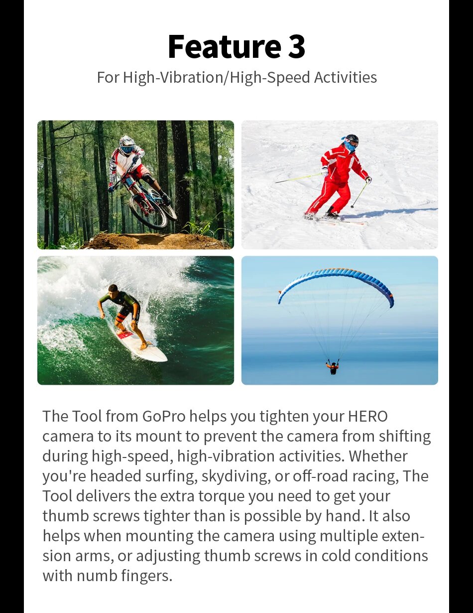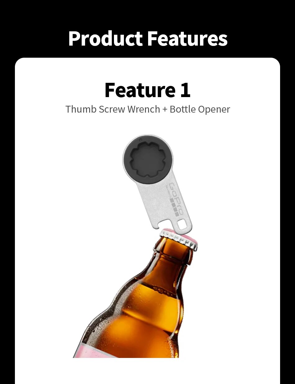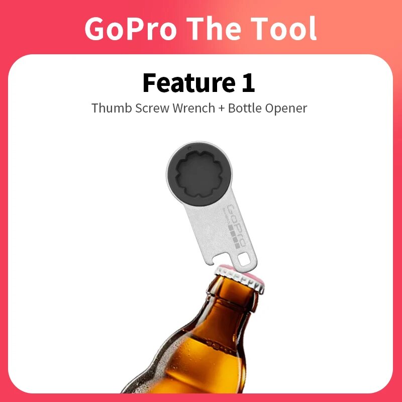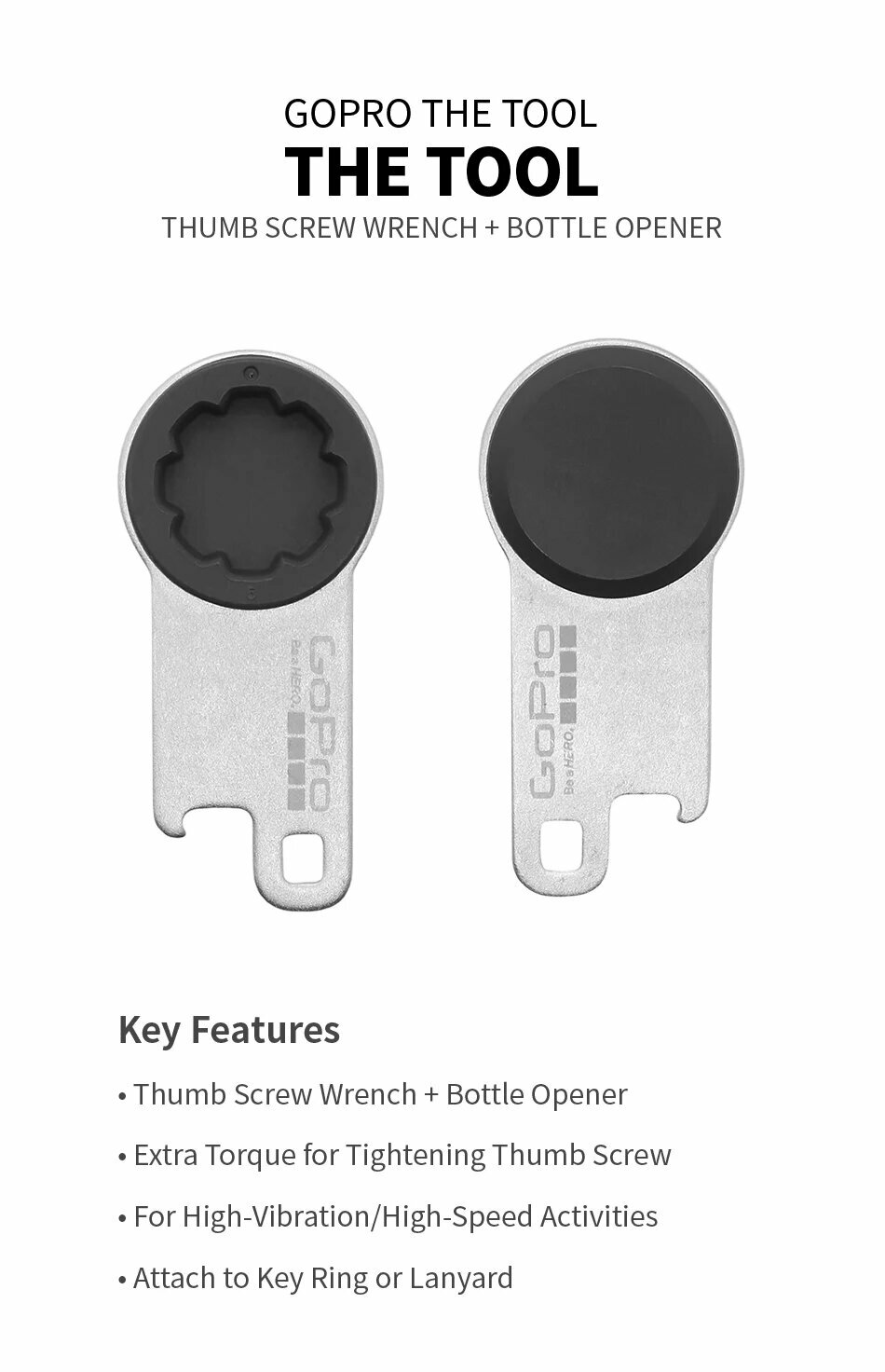Специальное приспособление The Tool позволяет легко затянуть болты вашей GoPro, чтобы предотвратить ослабление крепления камеры, ее смещение во время сильной вибрации или на высоких скоростях. Это идеальный вариант при монтаже, когда приходится задействовать несколько добавочных механизмов или регулировать болты окоченевшими пальцами в холодных погодных условиях. Это не только удобно, но и безопасно. Дополнительный бонус: механизм The Tool складывается как штопор для бутылок, так что вы можете использовать его для открывания одной из них, возвращаясь после долгой фотосессии. Вы также можете зафиксировать The Tool на вашем брелоке или одежде, чтобы в нужный момент всегда иметь крепление под рукой.