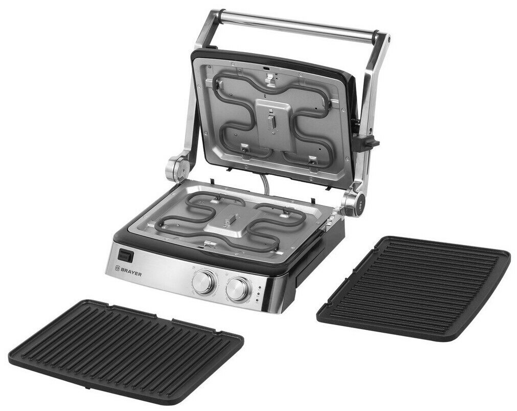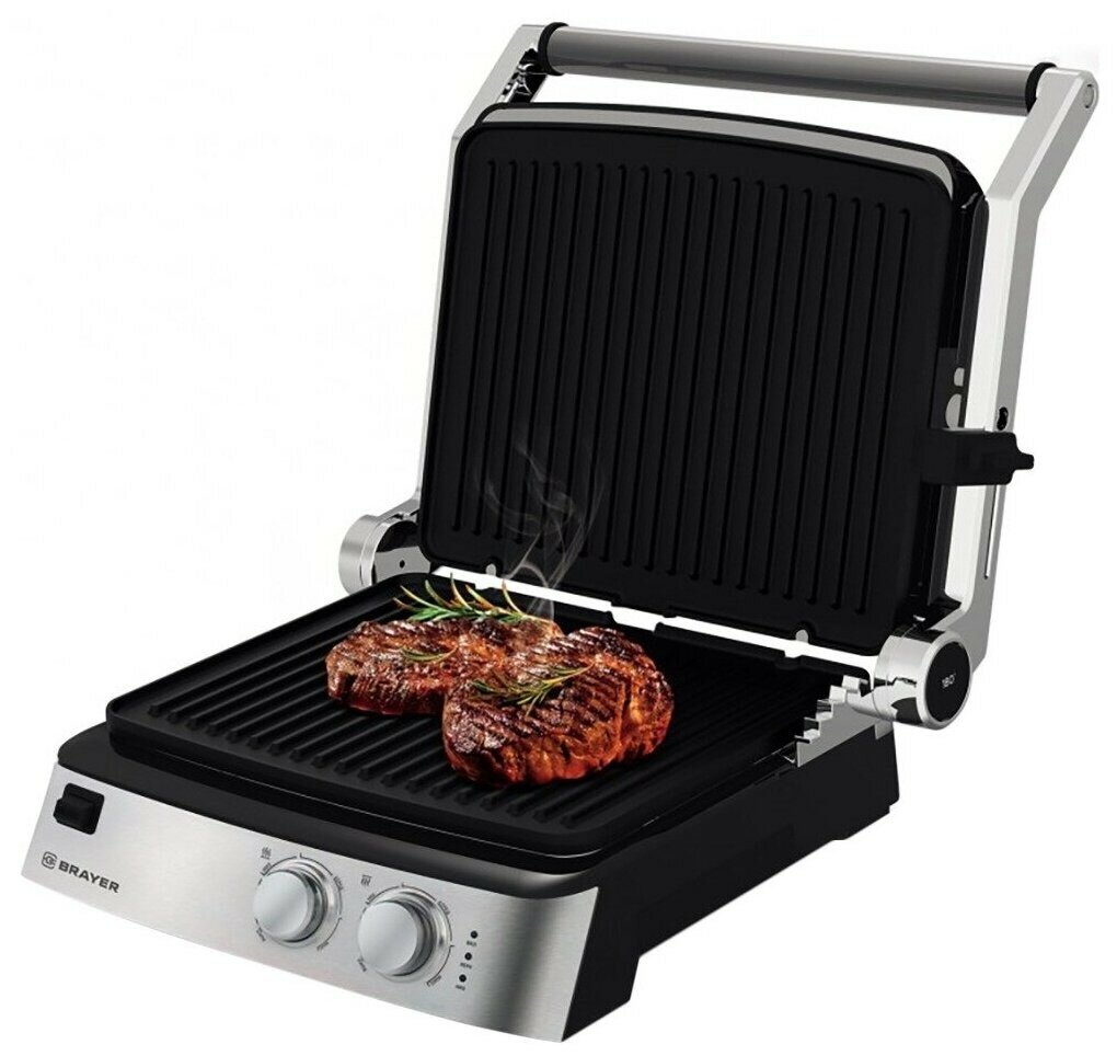Электрогриль Brayer — универсальная модель для приготовления различных блюд. Работает как контактный гриль, открытая жаровня и барбекю.