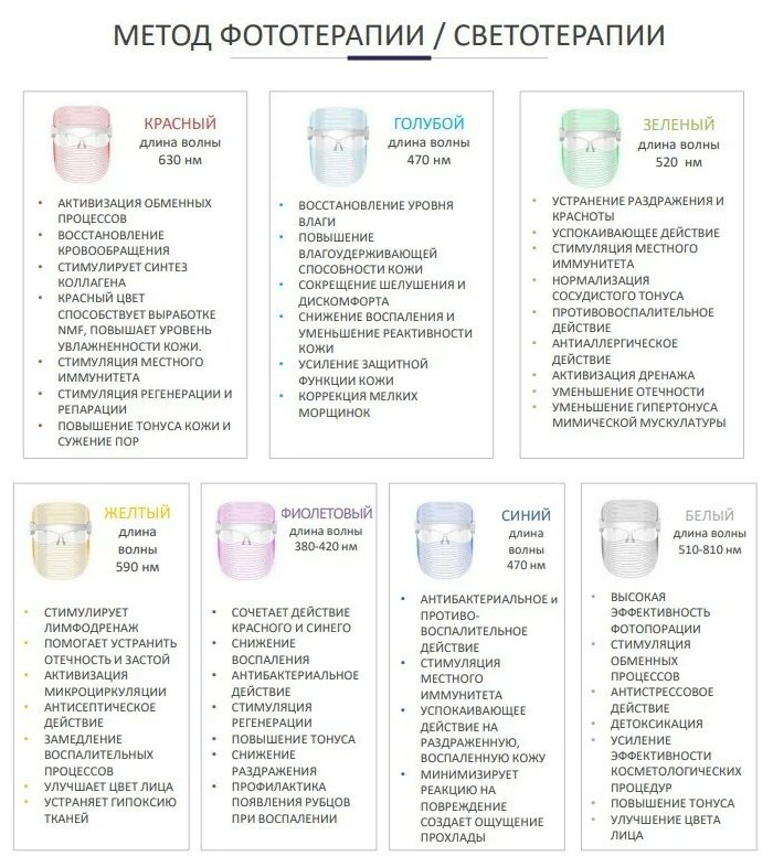 Маска для светотерапии с семью цветами светового спектра оказывает многогранное влияние, корректируя косметические проблемы кожи лица и шеи, замедляет возрастные изменения, улучшает цвет и внешний вид кожи. Какие проблемы решает светотерапия для лица с маской m1030 Применение беспроводной светодиодной маски рекомендуется для омоложения, профилактики раннего старения и оказания корректирующего косметического действия. На выбор цвета влияет исходное состояние и тип кожных покровов. M1030 Gezatone рекомендуется при проблемах: Возрастные признаки, атония и потеря тургора, формирование заломов, морщины разной локализации, снижение эластических свойств. Проблема дефицита влаги, сухость, дискомфорт и сопровождающие дегидратацию мелкие морщинки Светотерапия эффективна для любого типа, при «коже курильщика», бледности, стрессовой и уставшей коже. Повышенная продукция себума, несовершенства и воспаления, акне и постакне, расширенные поры и сниженный тонус кожных покровов. Изменение цвета, тусклая кожа, проявление пигментации, неровности микрорельефа в виде небольших шрамов и рубчиков. При повышенной кожной реактивности и склонности к красноте, лед маска снижает дискомфортные ощущения и эритему. Светодиодная led маска восстанавливает кожные покровы после стрессовых и травмирующих влияний, помогает подготовить кожу к процедурам и сократить восстановительный период. КАК РЕАГИРУЕТ КОЖА НА СВЕТОДИОДНУЮ LED МАСКУ Проникая в глубину кожных покровов, свет стимулирует выработку энергии, необходимой для синтеза веществ, ускоряющих коллагеногенез, синтез структурных компонентов дермы. Стимулирующее действие света улучшает кровоснабжение, дыхательные и детоксикационные процессы, метаболизм и восстановление. Помимо этого, волны света «тянут» за собой ингредиенты препаратов, нанесенных перед процедурой, что усиливает косметическое и корректирующее воздействие. цветов светодиодной LED маски для лица m1030 Каждый цвет обладает определенными характеристиками и оказывает «своё» действие на кожные покровы. Результаты применения светодиодной led маски для лица m1030 Жезатон Сеансы светотерапии освежают цвет лица и улучшают состояние кожных покровов. Улучшается уровень гидратации, сокращаются линии обезвоженности, уходят дискомфортные ощущения. Кожа спокойная и гладкая. Сокращаются признаки возраста, морщинки постепенно разглаживаются, кожа становится более упругой. Уменьшается пигментация и выравнивается тон кожных покровов. При воздействии на проблемную кожу, уменьшается воспаление, сужаются поры, сокращается продукция себума. Снижается частота рецидивов воспалений до 74%. Чувствительная кожа становится менее раздражимой, повышается её невосприимчивость к стрессорам.