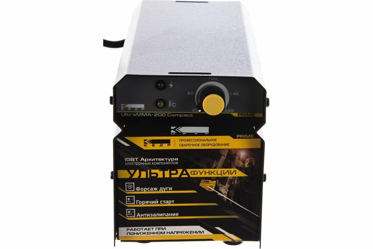 Сварочный инвертор Кедр UltraMMA-200 Compact (220В, 20-200А) 8012559 - сверхкомпактное исполнение аппарата гарантирует максимальное удобство при транспортировке и хранении в квартире или загородном доме. Легкая настройка при помощи единственного регулятора позволяет быстро подготовить оборудование к работе. Автоматические функции HotStart, ArcForce и AntiStick обеспечивают мгновенный поджиг и стабильное горение дуги, а также предотвращают «залипание» электрода. Регулируемый наплечный ремень повышает удобство перемещения и позволяет удерживать аппарат на весу при выполнении сварочных работ на высоте и в труднодоступных местах. Работа при пониженном напряжении допускает возможность подключения к маломощной электросети.Преимущества Стабильная работа в широком диапазоне сетевого напряжения Функции: интегрированные Hot Start, Arc Force, Антизалипание Защита от тепловой перегрузки Эффективное охлаждение IGВТ транзисторы Минимальное разбрызгивание металла Подходит для сварки всеми типами штучных электродов ПВ 30%
