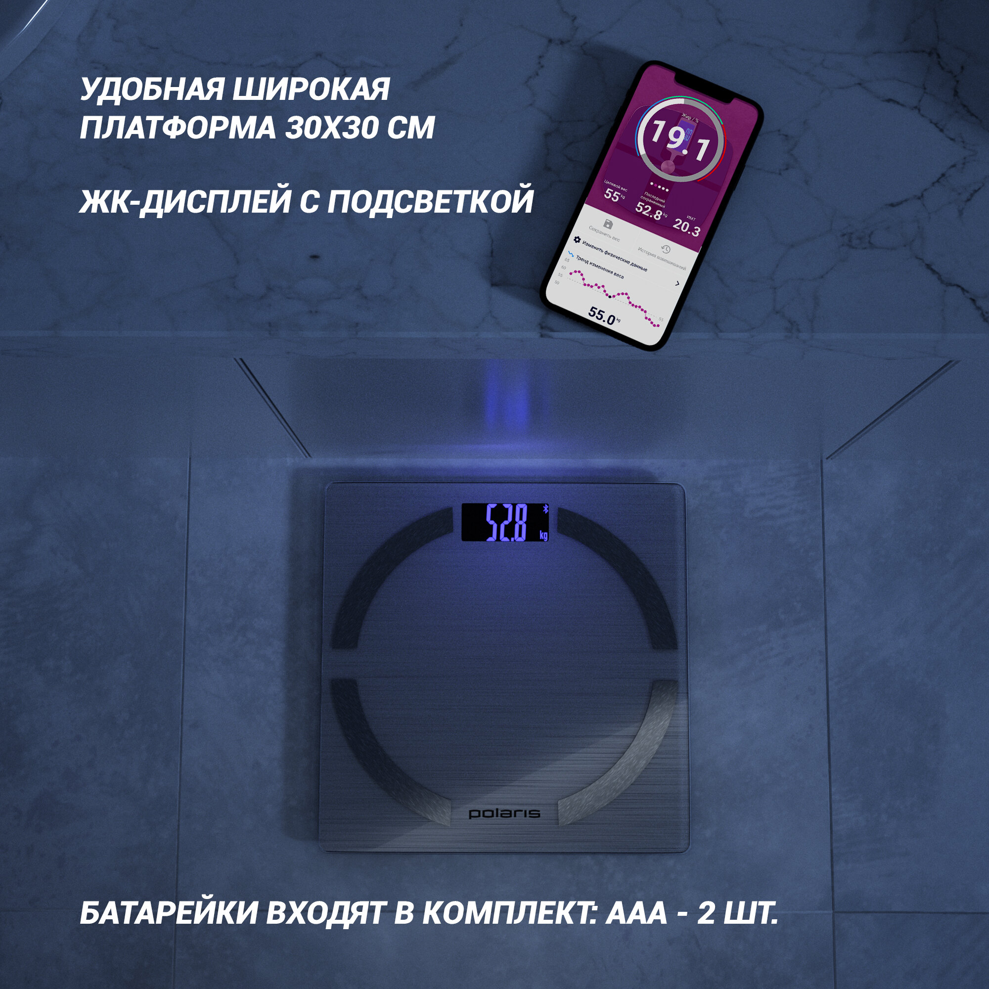 Отслеживайте динамику изменений через мобильное приложение IQ Home.Объем памяти на 20 пользователей.Сенсорная система для максимально точного измерения веса.Удобная широкая платформа (30х30 см).Измерение процентного содержания жировой, мышечной, костной массы и воды в организме.Расчет индекса массы тела BMI.Автоматическая синхронизация с мобильным устройствами на базе Android и iOS посредством Bluetooth.ЖК-дисплей с подсветкой.Автоматическое включение и отключение.Индикация работы батареек.Индикация превышения максимального веса.Питание: 2 х 1,5V AAA (входят в комплект).Максимальный вес: 180 кг.Цена деления: 0,1 кг.Подробная информация о работе напольных весов в приложении Polaris IQ Home.