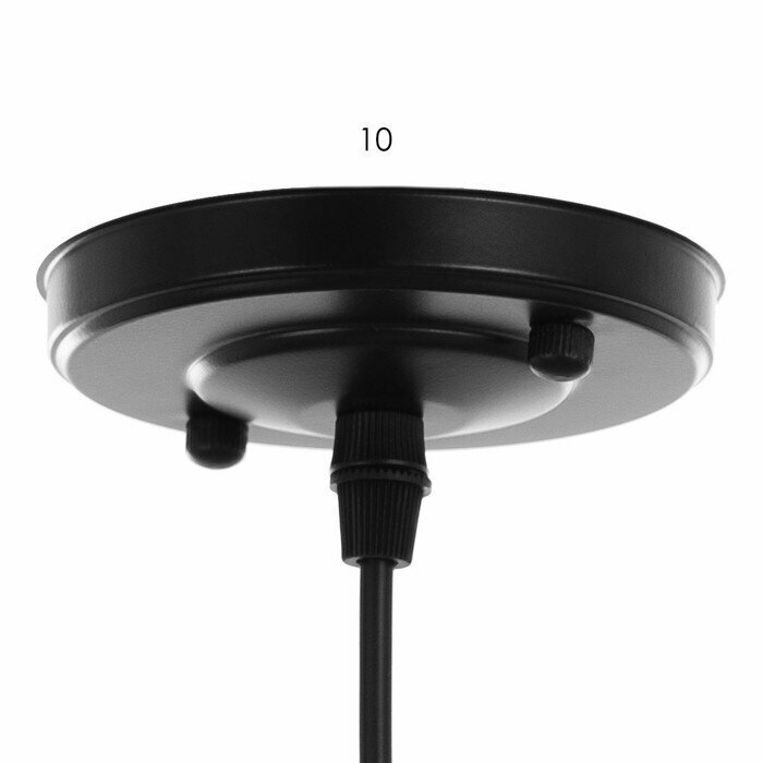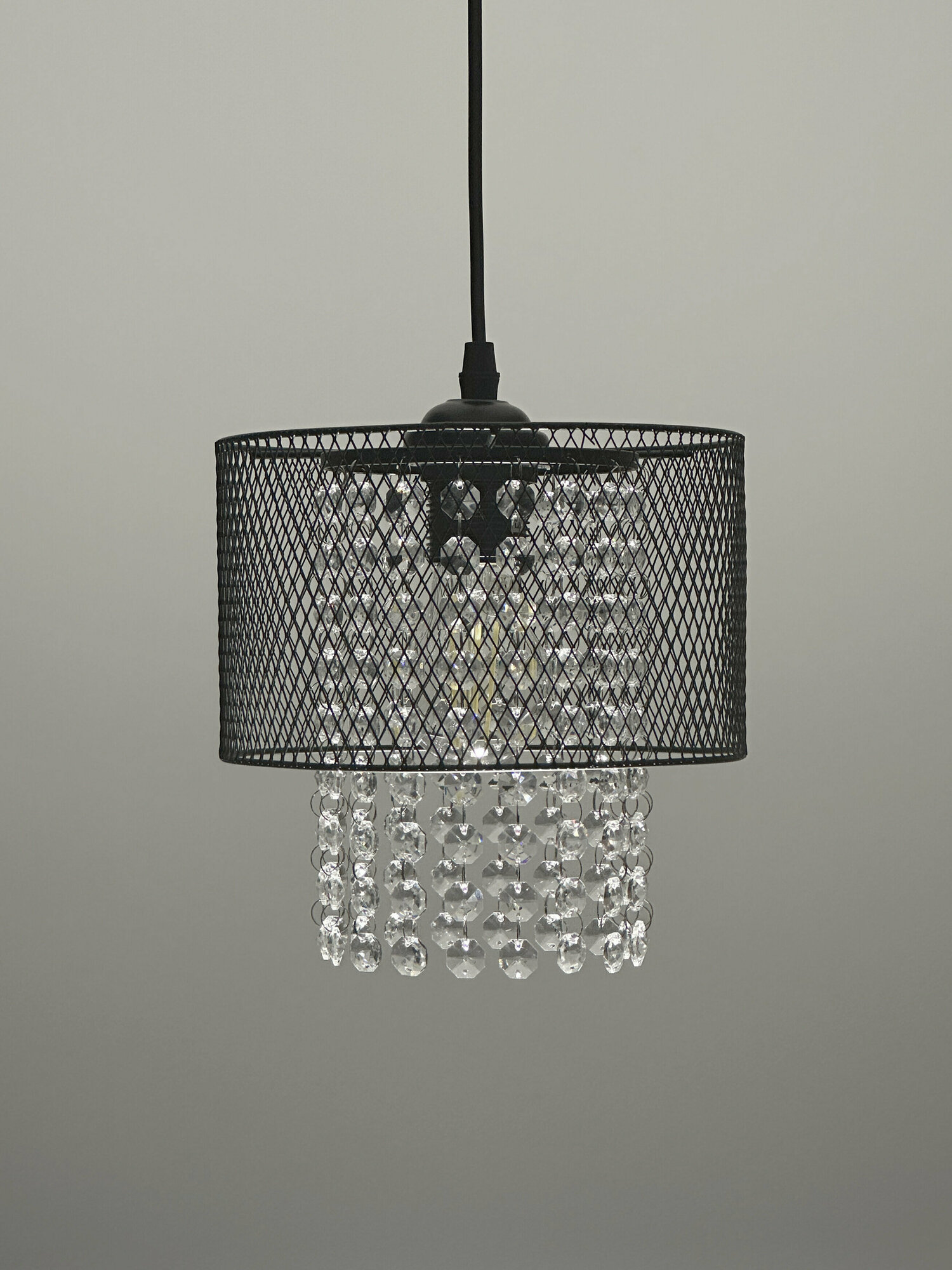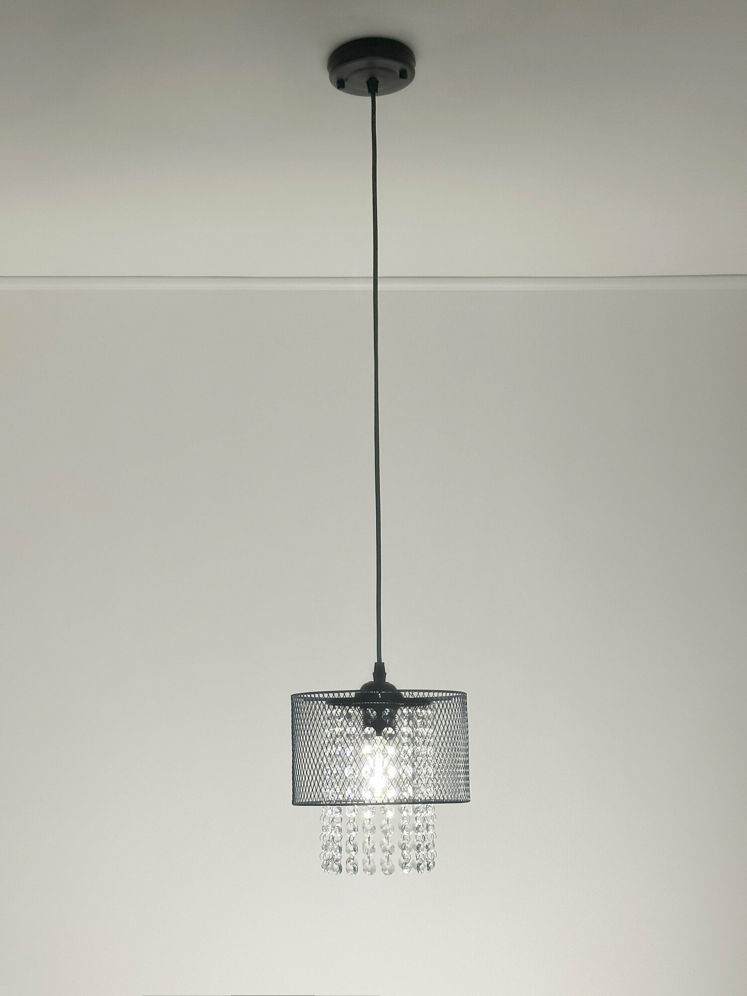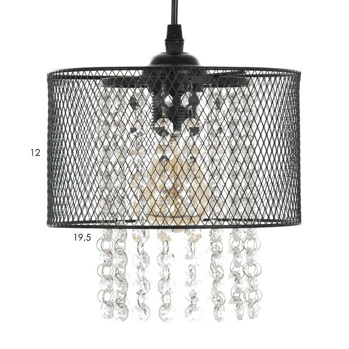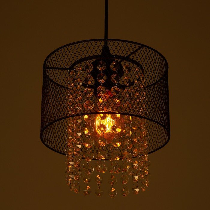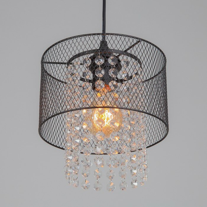 Светильник состоит из металлического основания и стеклянного плафона. Декор в виде мелкой черной сетки дополняют изящные прозрачные подвески. Такой дизайн актуален для большинства интерьерных решений, включая лофт и винтаж.