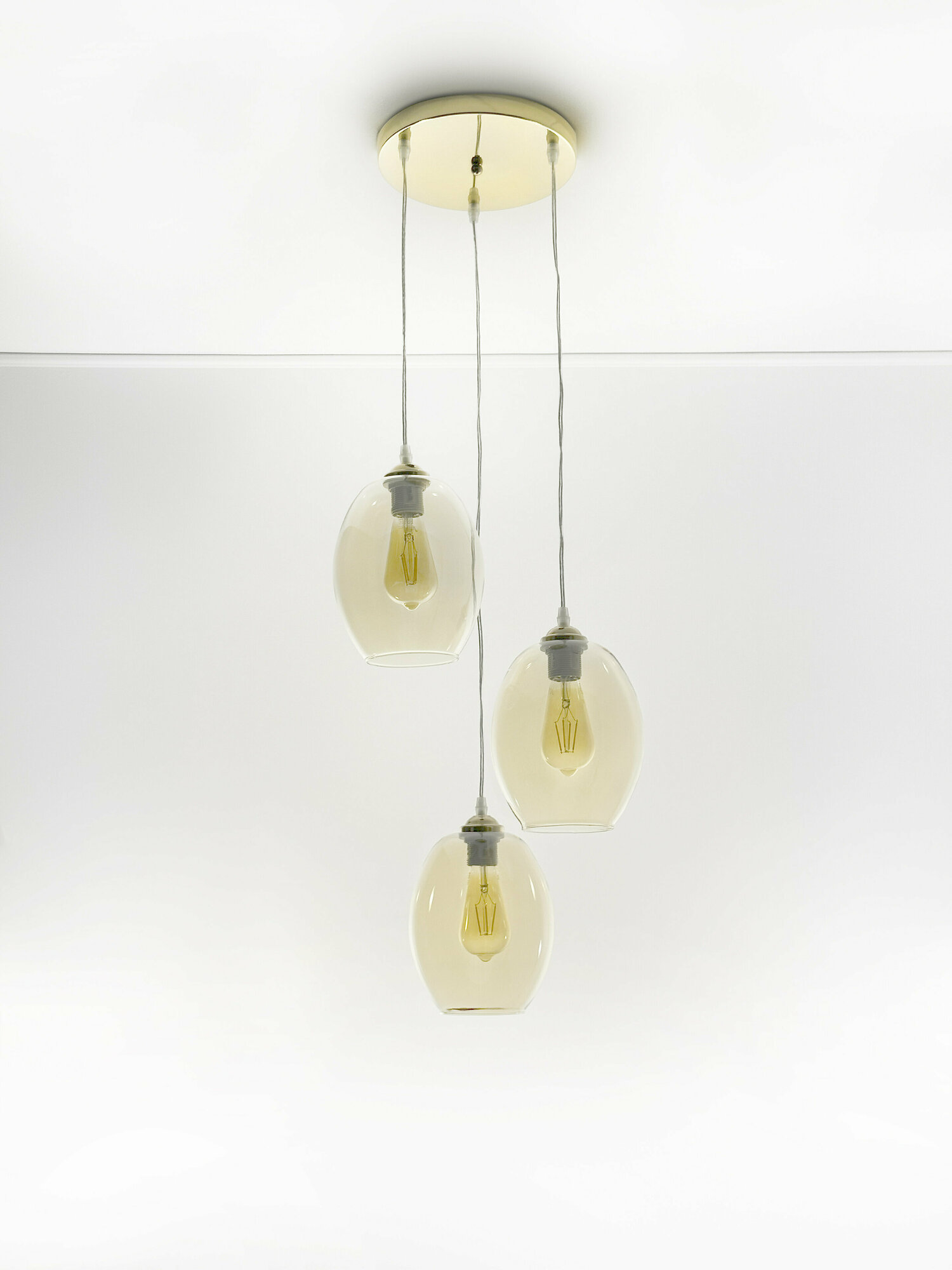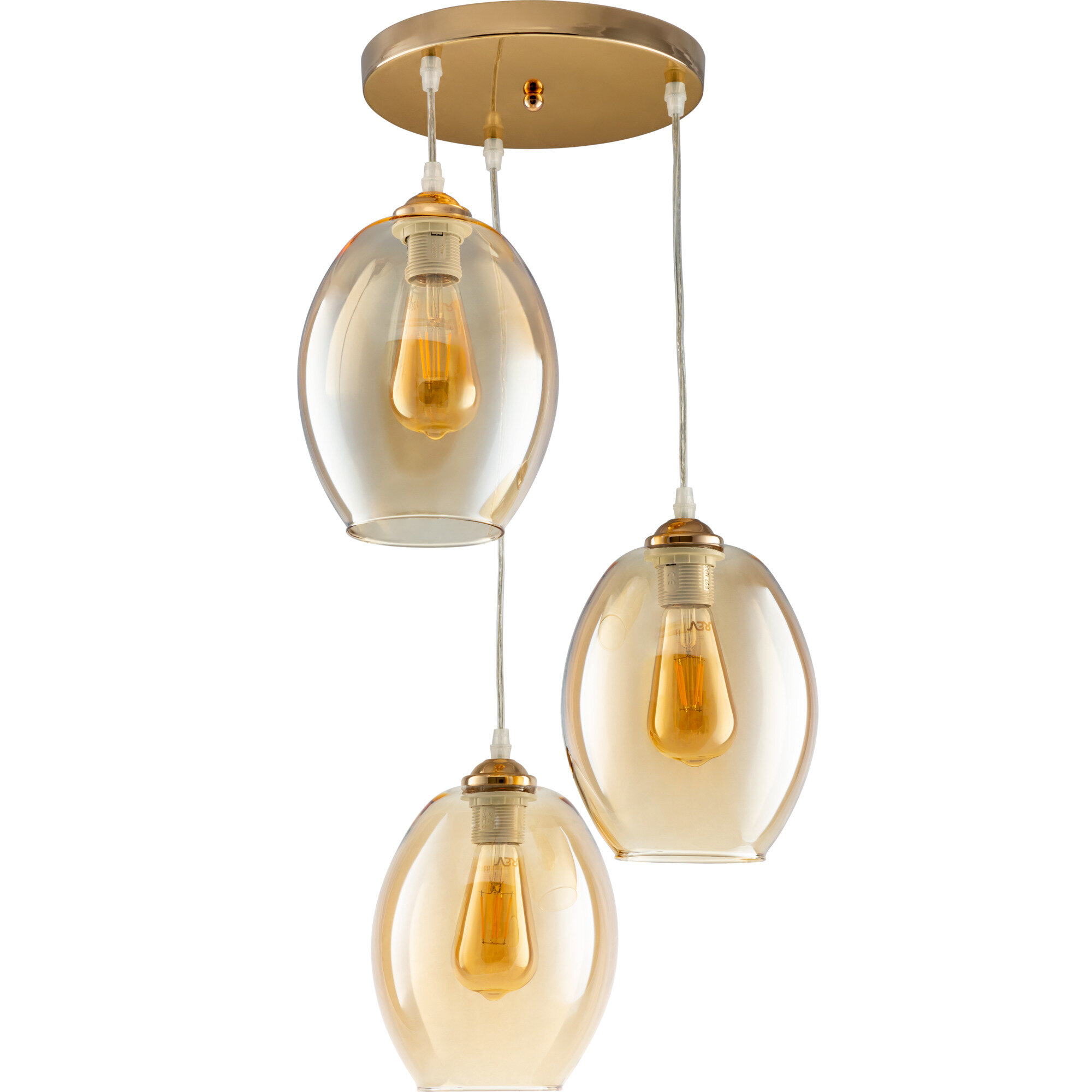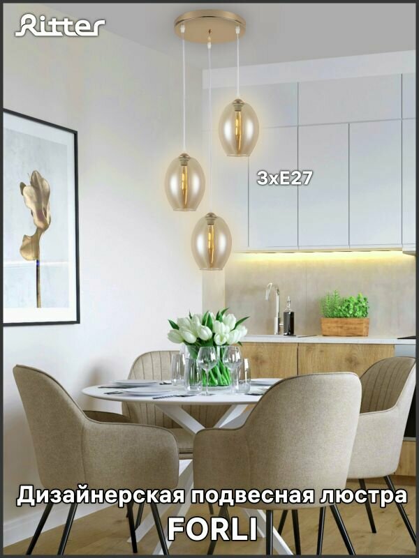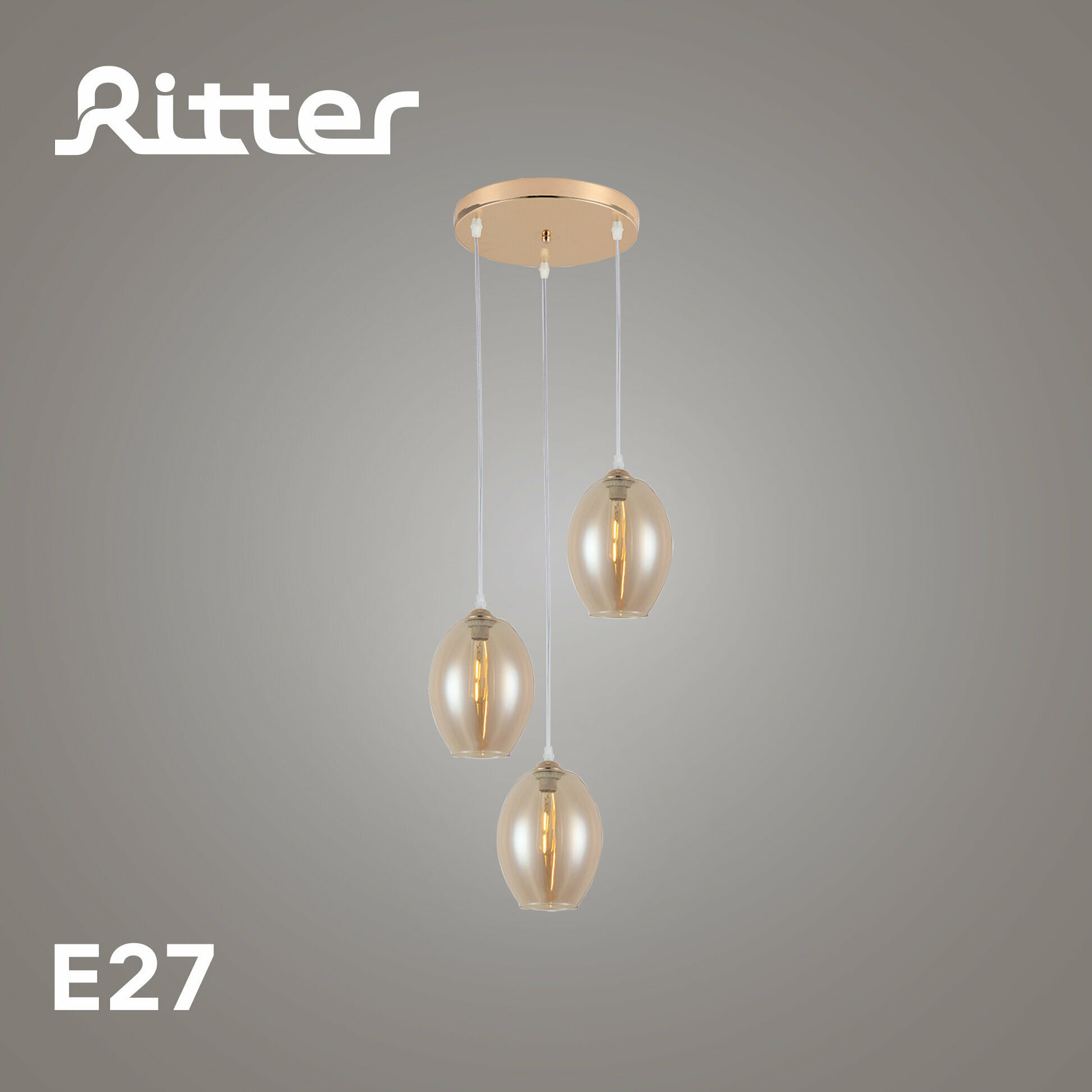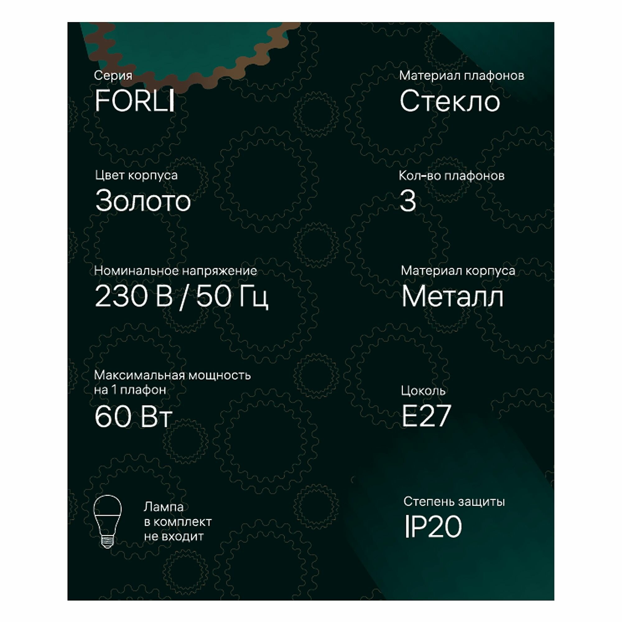 Потолочная подвесная люстра FORLI Ritter предназначена для освещения кухонь, гостиных, кафе и т.д. Подходит для акцентного освещения интерьеров в стиле лофт, винтаж. Люстра имеет три золотистых полупрозрачных плафона с цоколем Е27. Максимальная мощность устанавливаемой лампы - 60 Вт.