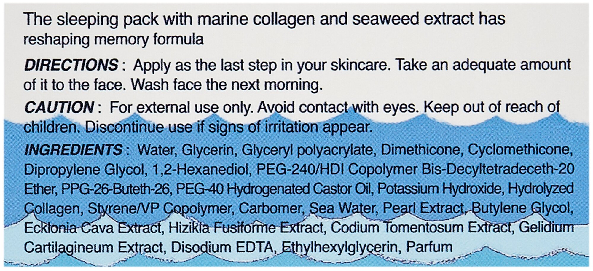 | Состав | вода, глицерин, глицерил полиакрилат, диметикон, циклометикон, дипропиленгликоль, 1,2-гександиол, пэг-240/сополимер гексаэтилен диизоцианата бис-децилтетрадецет-20 эфир ппг-26-бутет-26, пэг-40 гидрогенизированное касторовое масло, гидроксид калия, гидролизованный коллаген, стирол/сополимер поливинилпирролидона, карбомер, морская вода, экстракт жемчуга, бутиленгликоль, экстракт бурых морских водорослей ecklonia cava, экстракт бурых морских водорослей hizikia fusiforme, экстракт зеленых морских водорослей codium tomentosum, экстракт красных морских водорослей gelidium cartilagineum, динатрия эдта, этилгексилглицерин, ароматизатор. |